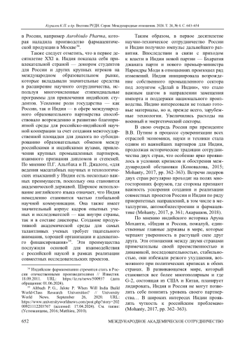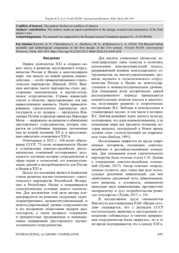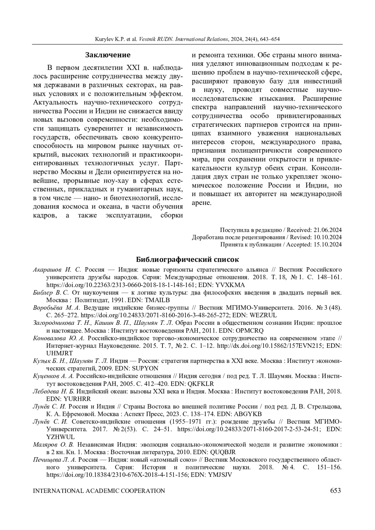 1. Акарашов И. С. Россия - Индия: новые горизонты стратегического альянса // Вестник Российского университета дружбы народов. Серия: Международные отношения. 2018. Т. 18, № 1. С. 148-161. ;. DOI: 10.22363/2313-0660-2018-18-1-148-161 EDN: YVXKMA