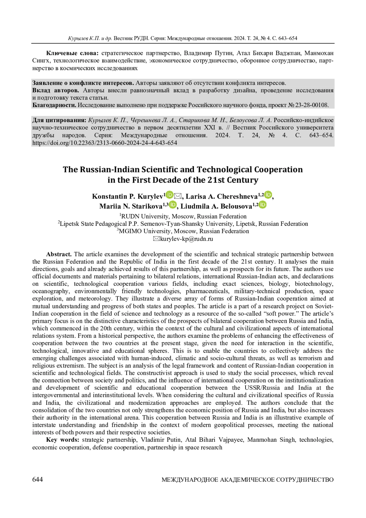 Рассматриваются развитие научно-технического стратегического партнерства между Российской Федерацией и Республикой Индия в первом десятилетии XXI в., основные направления, цели и достигнутые результаты, а также перспективы этого партнерства. Авторы используют официальные документы и материалы, посвященные двусторонним отношениям, международные российско-индийские акты, касающиеся научного, технологического сотрудничества в области точных наук, биологии, биотехнологии, океанографии, экологически чистых технологий, фармацевтики, военно-технического производства, исследования космоса, метеорологии, и демонстрируют спектр форм российско-индийского сотрудничества, направленных на взаимопонимание и прогресс обоих государств и народов. Статья является частью научно-исследовательского проекта, посвященного советско-индийскому сотрудничеству в сфере науки и технологий как ресурсам так называемой «мягкой силы».