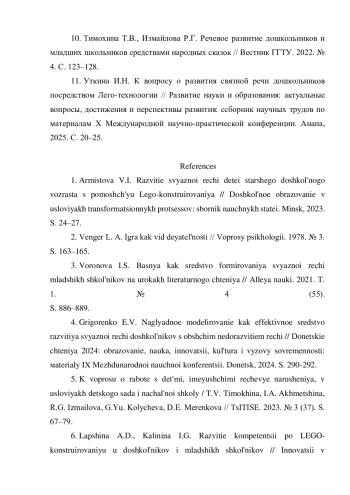 1. Армистова В.И. Развитие связной речи детей старшего дошкольного возраста с помощью Лего-конструирования // Дошкольное образование в условиях трансформационных процессов: сборник научных статей. Минск, 2023. С. 24-27. EDN: DEDJIJ