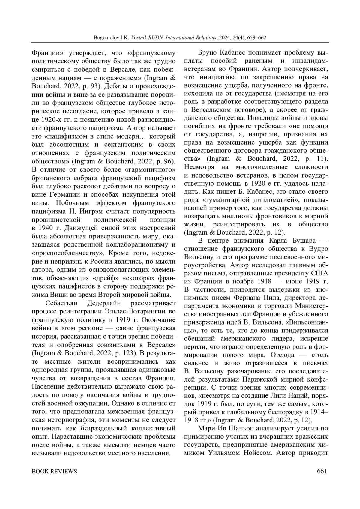Для цитирования: Богомолов И. К. Рецензия на книгу: Beyond the Great War: Making Peace in a Disordered World / ed. by N. Ingram, C. Bouchard. Toronto: University of Toronto Press, 2022. 239 p. // Вестник Российского университета дружбы народов. Серия: Международные отношения. 2024. Т. 24, № 4. С. 659–662. https://doi. org/10.22363/2313-0660-2024-24-4-659-662