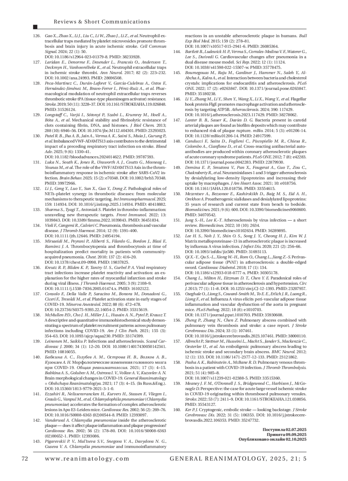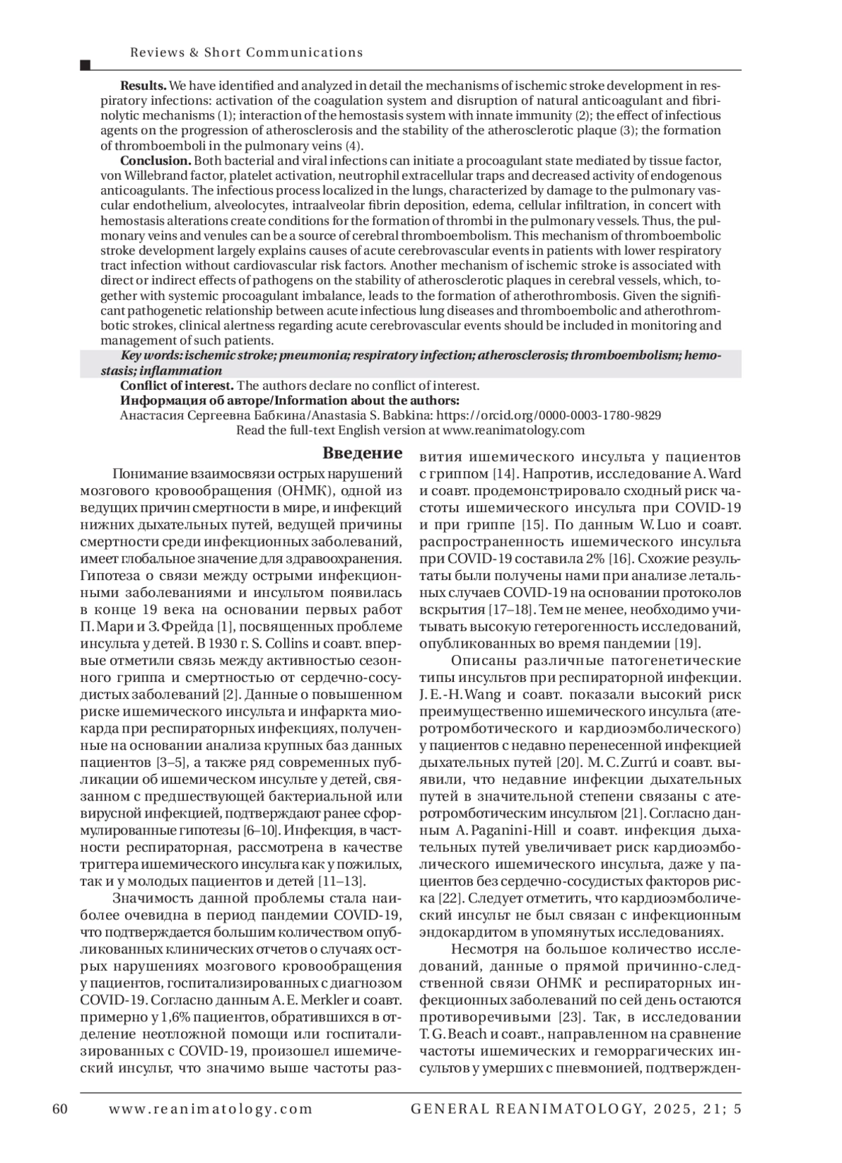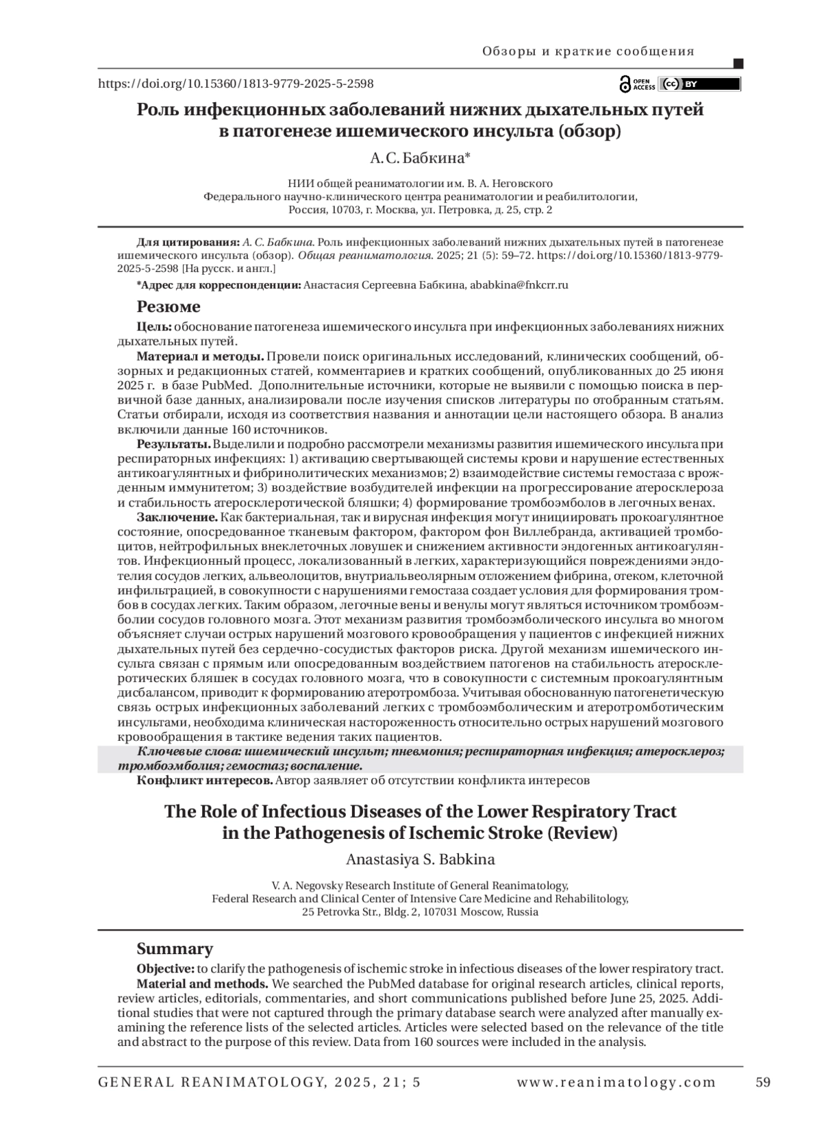 БАБКИНА А. С. РОЛЬ ИНФЕКЦИОННЫХ ЗАБОЛЕВАНИЙ НИЖНИХ ДЫХАТЕЛЬНЫХ ПУТЕЙ В ПАТОГЕНЕЗЕ ИШЕМИЧЕСКОГО ИНСУЛЬТА (ОБЗОР) // ОБЩАЯ РЕАНИМАТОЛОГИЯ. 2025. № 5, ТОМ 21