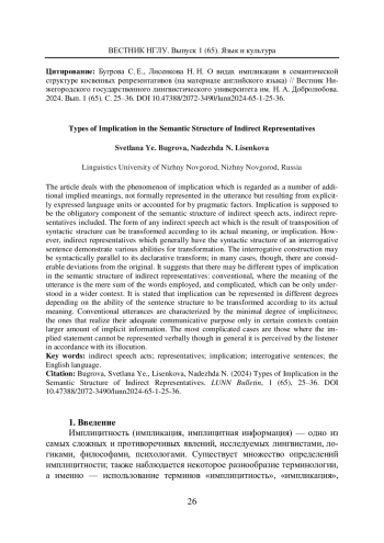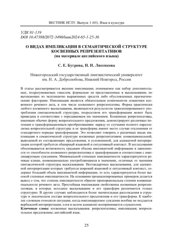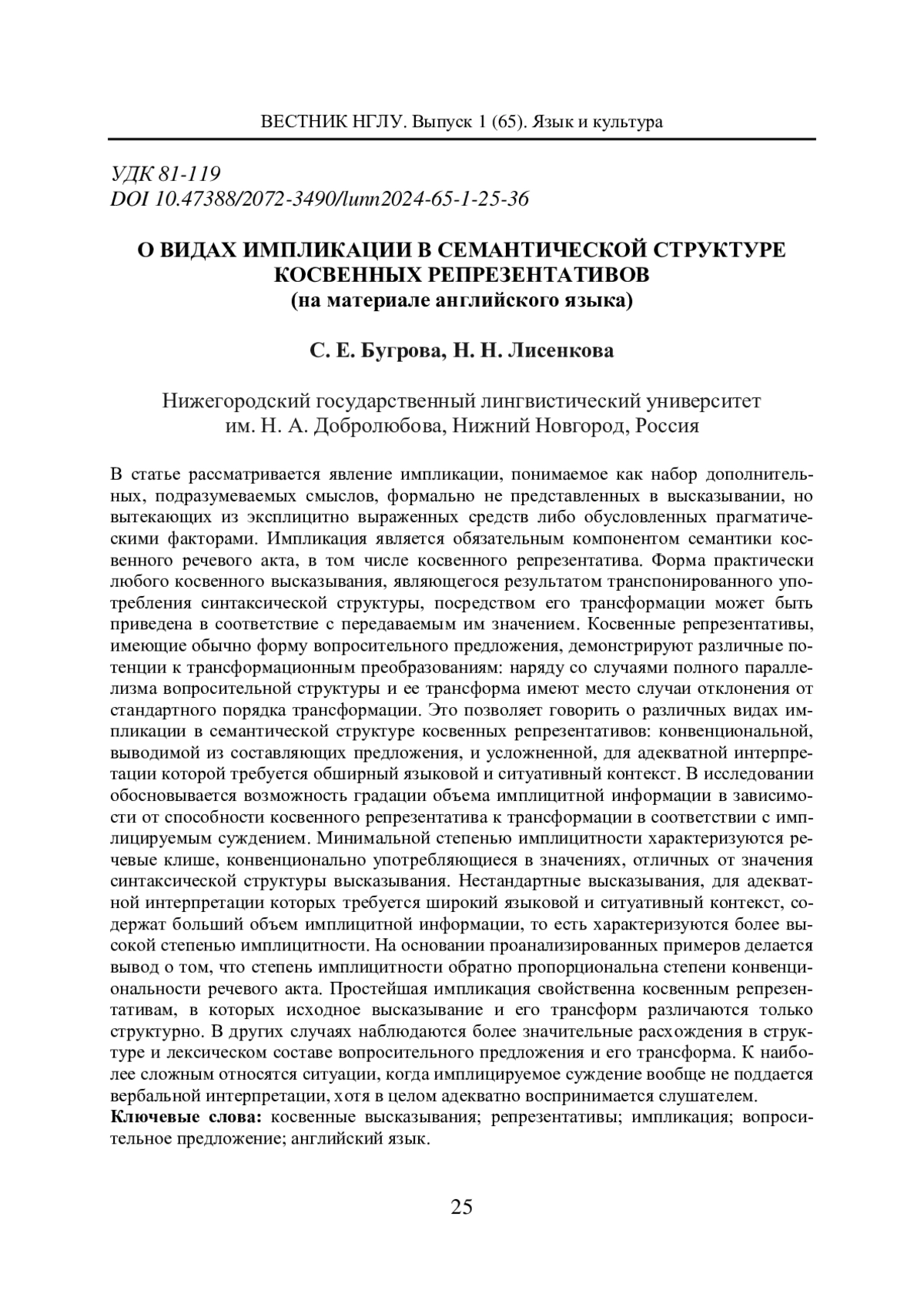 ЛИСЕНКОВА Н. Н., БУГРОВА С. Е. О ВИДАХ ИМПЛИКАЦИИ В СЕМАНТИЧЕСКОЙ СТРУКТУРЕ КОСВЕННЫХ РЕПРЕЗЕНТАТИВОВ (НА МАТЕРИАЛЕ АНГЛИЙСКОГО ЯЗЫКА) // ВЕСТНИК НИЖЕГОРОДСКОГО ГОСУДАРСТВЕННОГО ЛИНГВИСТИЧЕСКОГО УНИВЕРСИТЕТА ИМ. Н. А. ДОБРОЛЮБОВА. 2024. № 65
