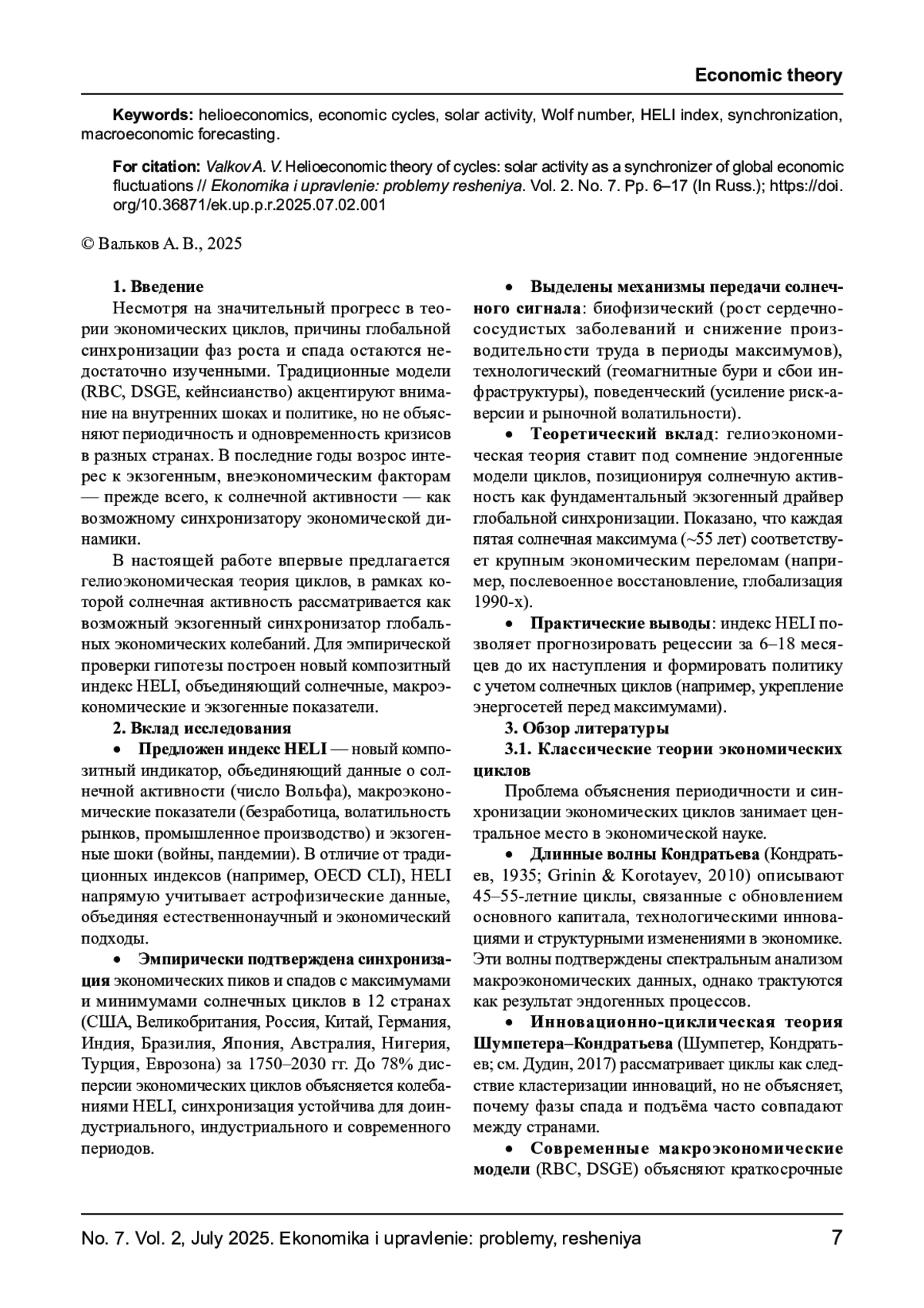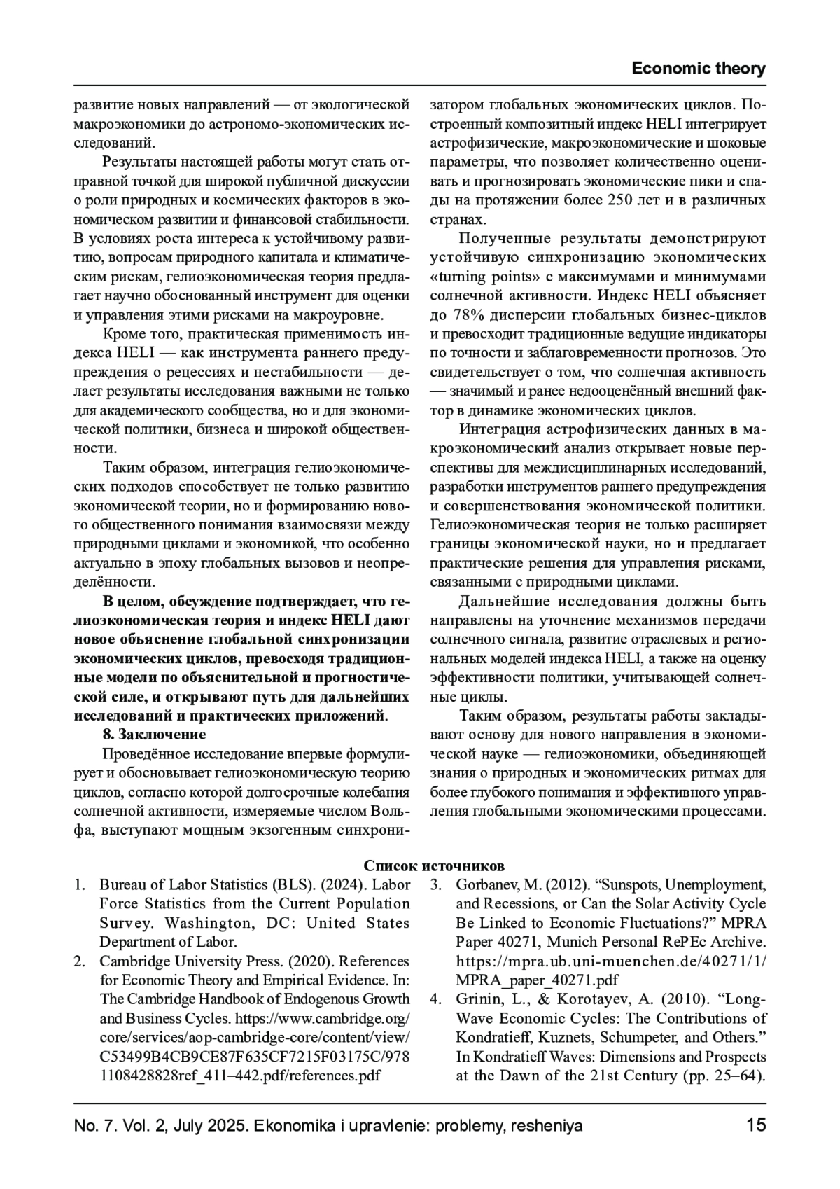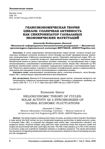 В статье представлена гелиоэкономическая теория циклов, согласно которой долгосрочные колебания солнечной активности (число Вольфа) выступают фундаментальным экзогенным синхронизатором глобальных экономических циклов. Предложен композитный индекс HELI, интегрирующий данные о солнечной активности, макроэкономические индикаторы и экзогенные шоки. Эмпирический анализ на данных крупнейших экономик показывает, что экономические пики и спады синхронизированы с максимумами и минимумами солнечных циклов. Индекс HELI объясняет до 78% дисперсии экономических циклов и опережает традиционные индикаторы в прогнозировании рецессий. Результаты демонстрируют значимость интеграции астрофизических данных в макроэкономический анализ для повышения точности прогнозирования и управления рисками.