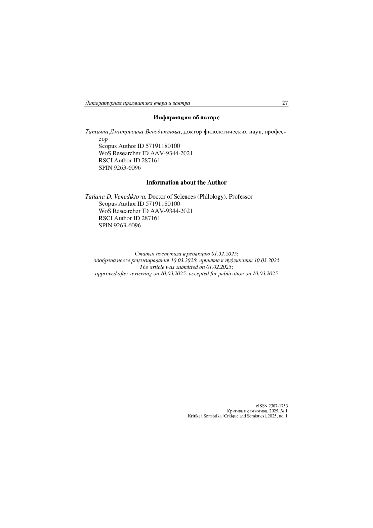 ВЕНЕДИКТОВА Т. Д. ЛИТЕРАТУРНАЯ ПРАГМАТИКА ВЧЕРА И ЗАВТРА // КРИТИКА И СЕМИОТИКА. 2025. № 1