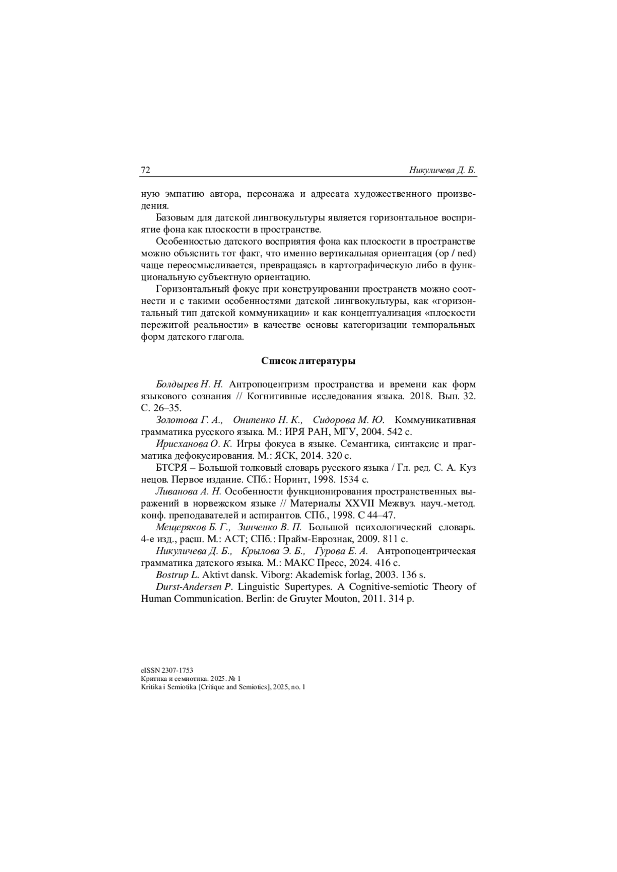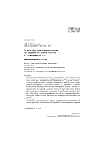 НИКУЛИЧЕВА Д. Б. ДАТСКИЕ ПРОСТРАНСТВЕННЫЕ НАРЕЧИЯ КАК СРЕДСТВО СУБЪЕКТНОЙ ЭМПАТИИ В ХУДОЖЕСТВЕННОМ ТЕКСТЕ // КРИТИКА И СЕМИОТИКА. 2025. № 1