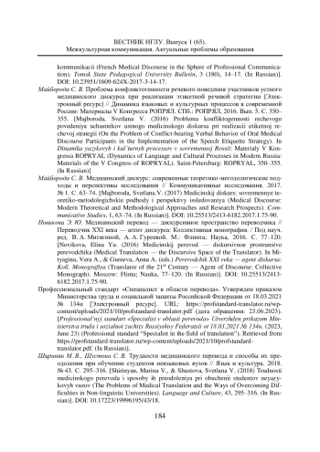 3. Корнеева Л. И., Куклина М. К. Специфичность процесса обучения медицинскому переводу // Вестник ПНИПУ. Проблемы языкознания и педагогики. 2022. № 4. С. 140-149. EDN: YANZPQ