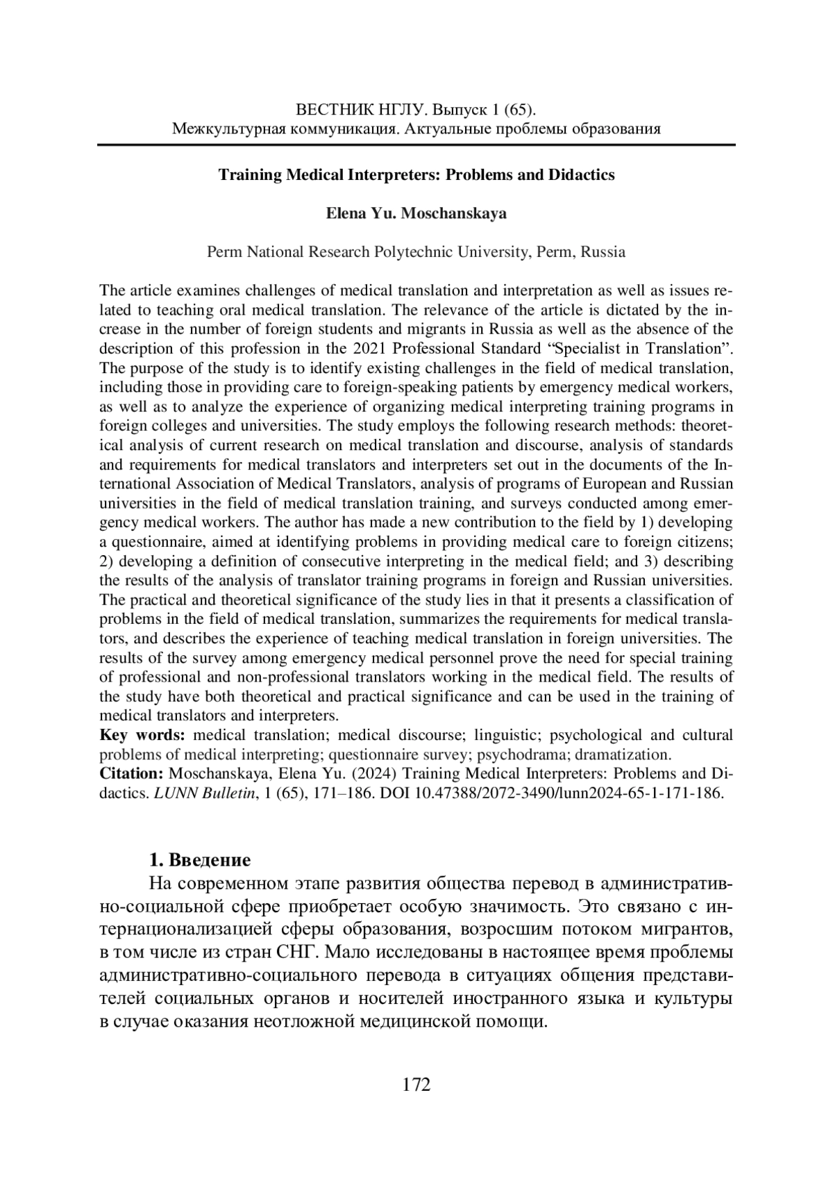 Статья посвящена проблемам медицинского перевода и вопросам обучения устному медицинскому переводу. Актуальность статьи обусловлена увеличением числа иностранных студентов и мигрантов в России, отсутствием описания данной специальности в профессиональном стандарте «Специалист в области перевода» от 2021 года. Цель исследования - выявление проблем медицинского перевода, в том числе и при оказании помощи иноязычным пациентам работниками скорой медицинской помощи, а также анализ опыта организации обучения устному медицинскому переводу в зарубежных вузах. Для достижения поставленной цели использовались следующие методы исследования: теоретический анализ работ, посвященных медицинскому переводу и дискурсу, рассмотрение требований к медицинским переводчикам, изложенных в документах Международной ассоциации устных медицинских переводчиков, анализ программ европейских университетов в сфере обучения медицинскому переводу, анкетирование сотрудников скорой медицинской помощи. Научная новизна состоит в том, что автором разработана анкета для выявления проблем при оказании медицинской помощи иностранным гражданам, предложено авторское определение устного последовательного перевода в медицинской сфере, описаны результаты анализа программ подготовки переводчиков в зарубежных вузах. Представлен перечень проблем в сфере медицинского перевода, обобщены требования к медицинским переводчикам, описан опыт обучения медицинскому переводу в зарубежных вузах. Результаты анкетирования работников скорой медицинской помощи доказывают необходимость подготовки профессиональных и повышения квалификации непрофессиональных переводчиков, работающих в медицинской сфере. Результаты исследования имеют как теоретическую, так и практическую значимость и могут быть использованы при подготовке медицинских переводчиков.