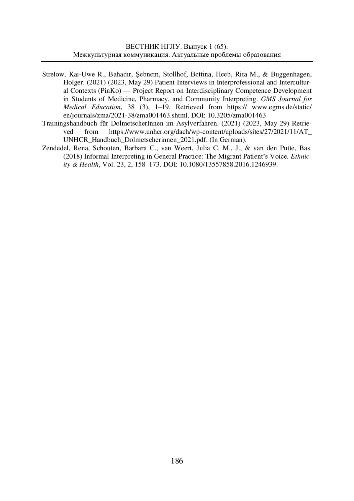 24. Strelow, Kai-Uwe R., Bahadır, Şebnem, Stollhof, Bettina, Heeb, Rita M., & Buggenhagen, Holger. (2021) (2023, May 29) Patient Interviews in Interprofessional and Intercultural Contexts (PinKo) - Project Report on Interdisciplinary Competence Development in Students of Medicine, Pharmacy, and Community Interpreting. GMS Journal for Medical Education, 38 (3), 1-19. Retrieved from https://www.egms.de/static/ en/journals/zma/2021-38/zma001463.shtml. DOI: 10.3205/zma001463