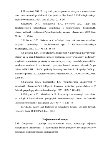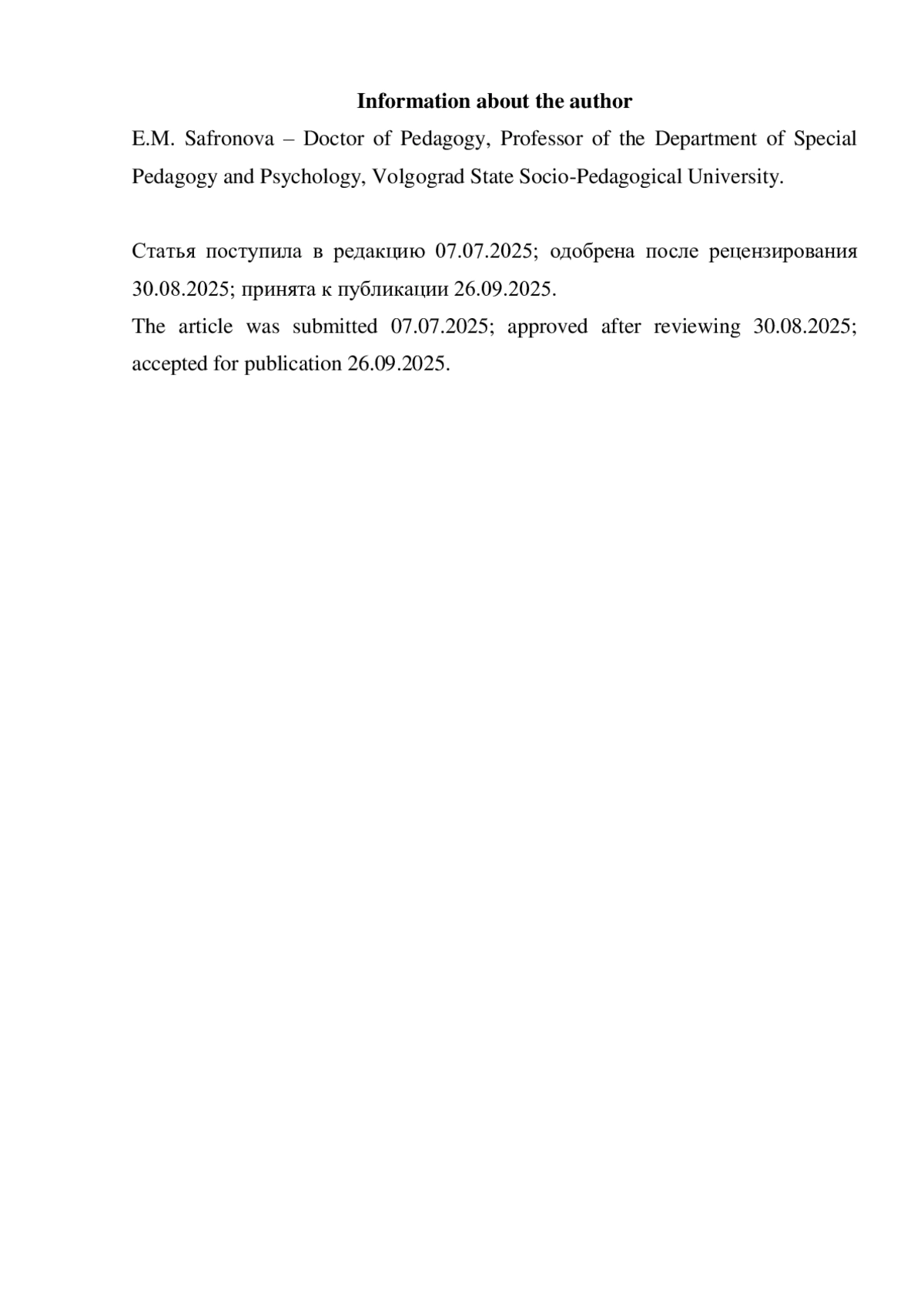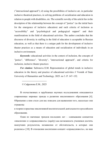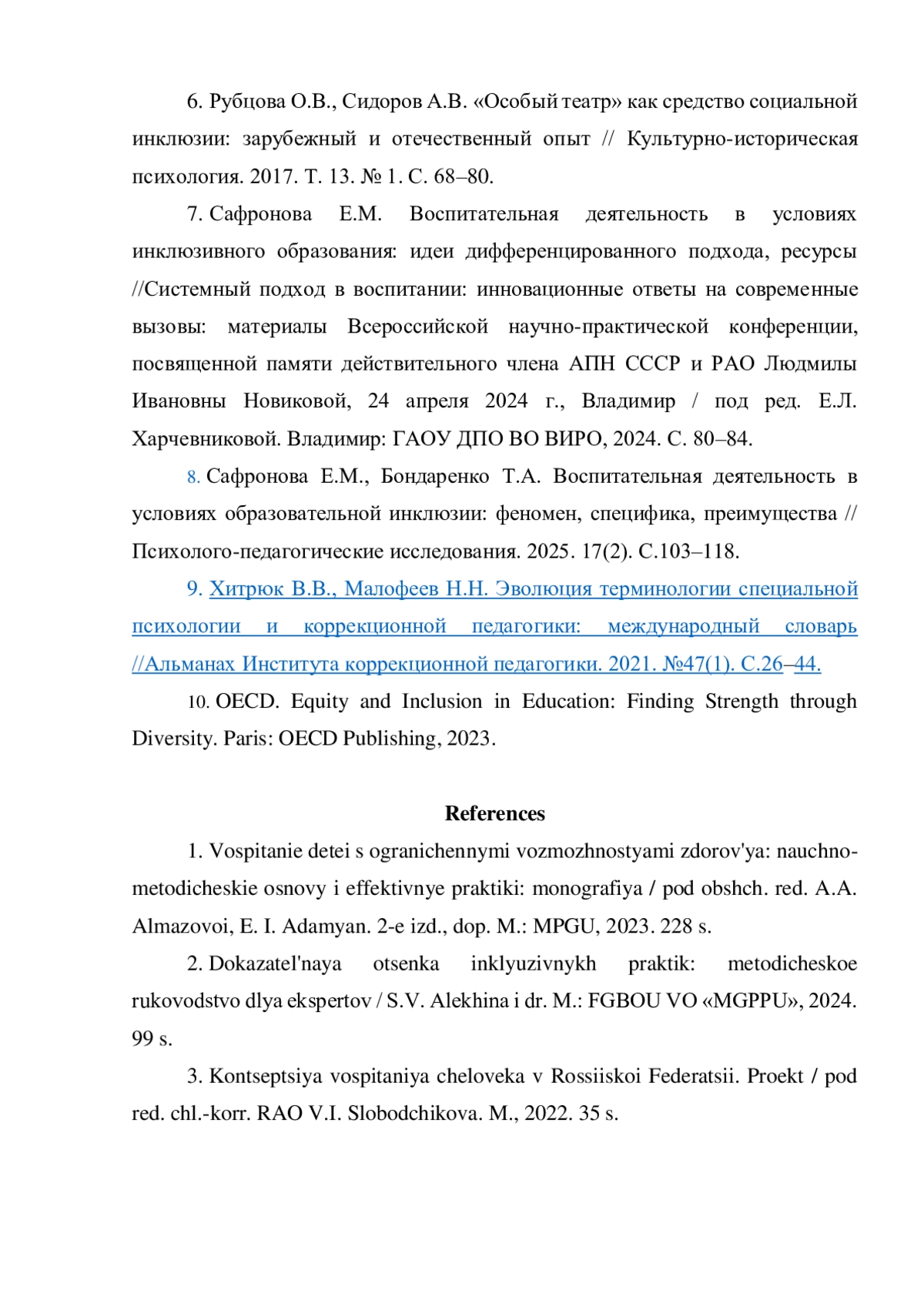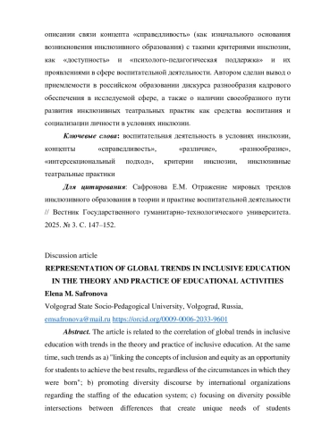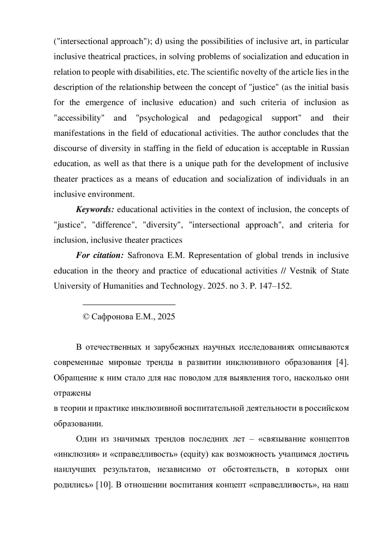 САФРОНОВА Е. М. ОТРАЖЕНИЕ МИРОВЫХ ТРЕНДОВ ИНКЛЮЗИВНОГО ОБРАЗОВАНИЯ В ТЕОРИИ И ПРАКТИКЕ ВОСПИТАТЕЛЬНОЙ ДЕЯТЕЛЬНОСТИ // ВЕСТНИК ГОСУДАРСТВЕННОГО ГУМАНИТАРНО-ТЕХНОЛОГИЧЕСКОГО УНИВЕРСИТЕТА. 2025. № 3