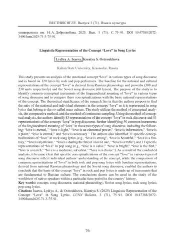 Данное исследование посвящено изучению эмоционального концепта ЛЮБОВЬ в различных песенных дискурсах. Материалом для анализа послужили 120 текстов песен рок-исполнителей и поп-исполнителей. Национально-культурные репрезентации концепта ЛЮБОВЬ представлены в русской фразеологии и пословицах (388 и 230 единиц соответственно) и в советском песенном дискурсе (60 текстов). Цель исследования - выявить общие приращения лингвокультурного смысла «любовь» в различных песенных дискурсах, сравнить данные концептуализации с национальными базовыми репрезентациями. Теоретическая значимость предложенной работы определяется тем, что решается вопрос о соотношении в текстах так называемой массовой культуры общенационального и индивидуально-авторского элемента в одном из центральных концептов данной сферы ЛЮБОВЬ. Методы, использованные в настоящем исследовании: концептуального анализа, сравнительный метод, метод сплошной выборки. Методом концептуального анализа было выделено 83 репрезентации концепта ЛЮБОВЬ в рок-дискурсе, 81 репрезентация концепта ЛЮБОВЬ в поп-дискурсе. Среди рок- и поп-дискурсов было установлено 50 общих приращений лингвокультурного смысла ЛЮБОВЬ, некоторые из них: «любовь - ментальное», «любовь - свет», «любовь - стихия», «любовь - информация», «любовь - растение», «любовь - вечная», «любовь - необходимая». Количество специфических концептуализаций в рок-текстах - 33 (например, «любовь - прочная», «любовь - прекрасная», «любовь - фантастика», «любовь - мистика», «любовь - разделение участи любимого», «любовь - пустяк»), в поп-текстах - 31 (например, «любовь - ценность», «любовь - светлая», «любовь - первая», «любовь - поиск», «любовь - лекарство, спасение», «любовь - выбор»). В результате проведенного анализа было выяснено, что специфические концептуализации понятия «любовь» в различных дискурсах отражают индивидуально-авторское понимание рассматриваемого нами концепта. Сопоставление общих репрезентаций, выделенных в различных видах дискурсов, с репрезентациями, представленными в национальной русской фразеологии и советском песенном дискурсе, позволило сделать вывод о том, что основу концепта ЛЮБОВЬ в рок-текстах и поп-текстах составляют приращения, являющиеся фундаментальными для русской культуры. Сделанные выводы могут быть использованы при исследовании языковой картины мира носителей языка той или иной эпохи.