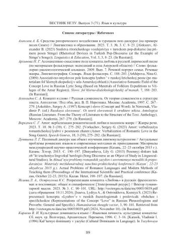 6. Исаева Л. А., Остроухова К.С. Репрезентации концепта “Любовь” в русских фразеологизмах и пословицах: общее и специфическое [Электронный ресурс] // Вектор гуманитарной мысли. 2023. № 3. С. 90-101. URL: http://vectorgm.ru/data/mc/0005/0039.pdf (дата обращения: 10.11.2024). EDN: PVYQPZ