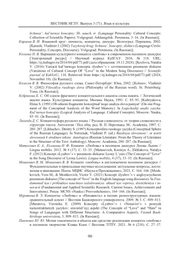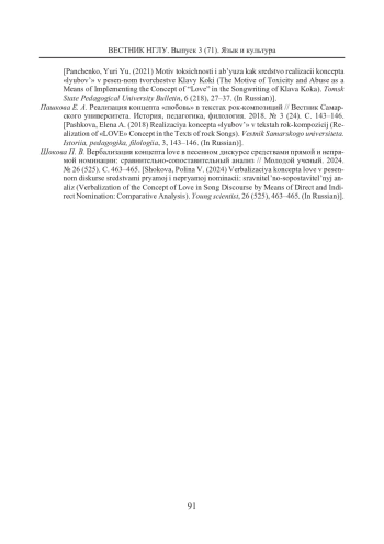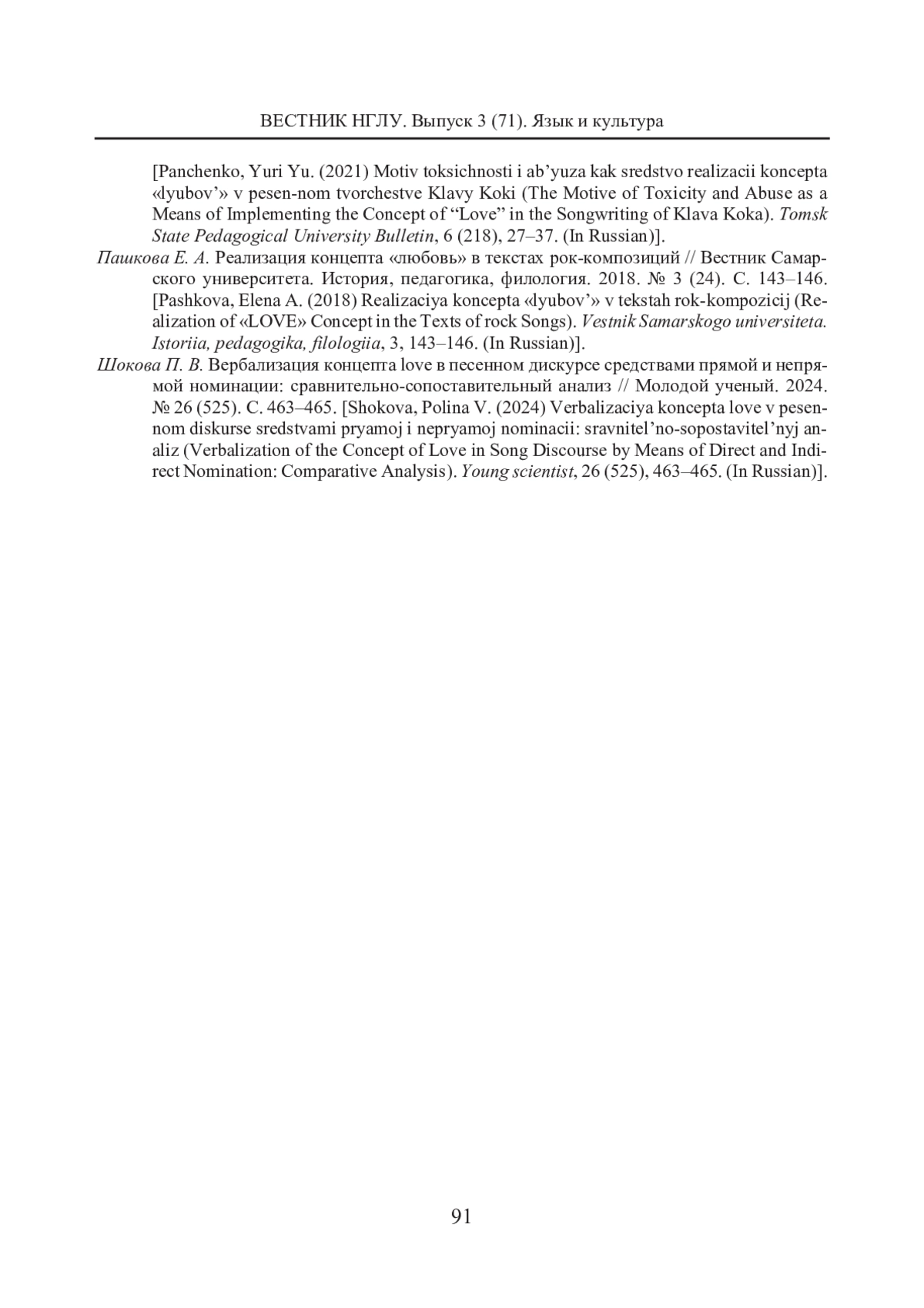 16. Пашкова Е. А. Реализация концепта “любовь” в текстах рок-композиций // Вестник Самарского университета. История, педагогика, филология. 2018. № 3 (24). С. 143-146. EDN: VMODFP