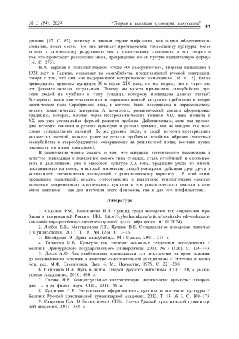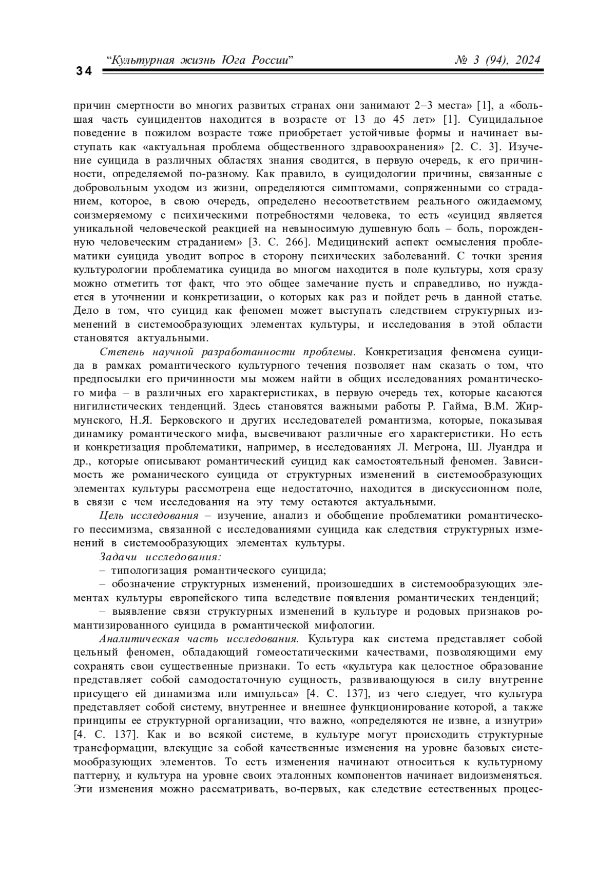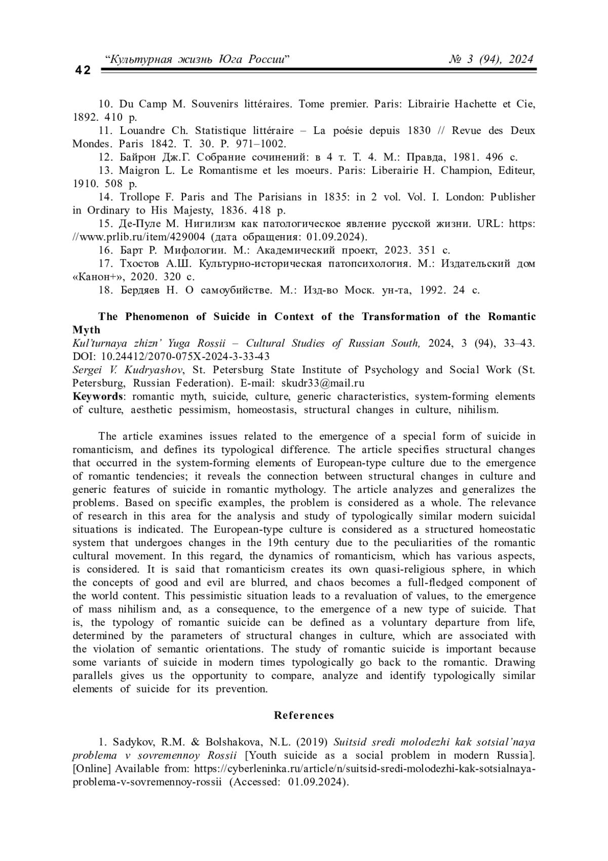 КУДРЯШОВ С. В. ФЕНОМЕН СУИЦИДА В КОНТЕКСТЕ ТРАНСФОРМАЦИИ РОМАНТИЧЕСКОГО МИФА // КУЛЬТУРНАЯ ЖИЗНЬ ЮГА РОССИИ. 2024. № 3 (94)