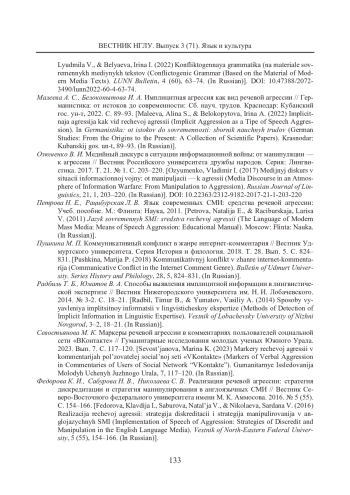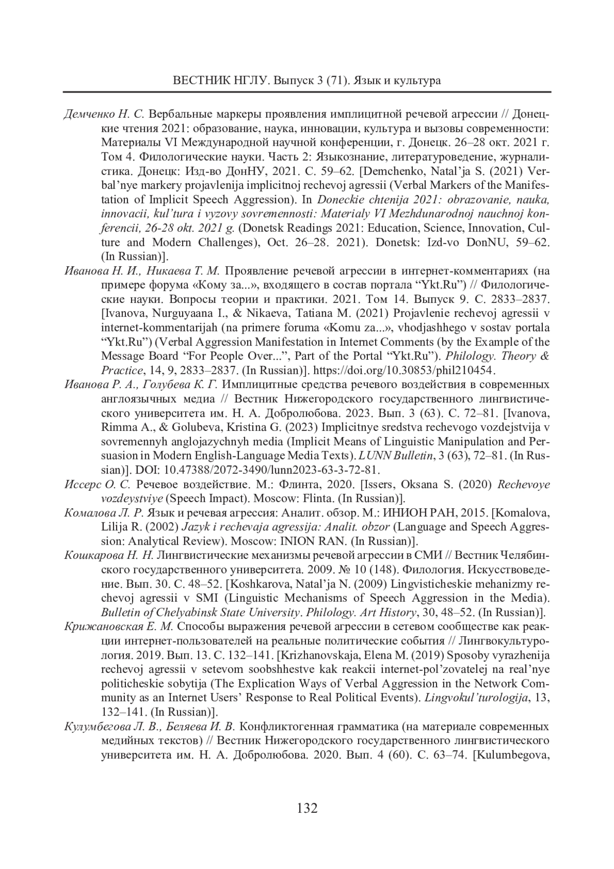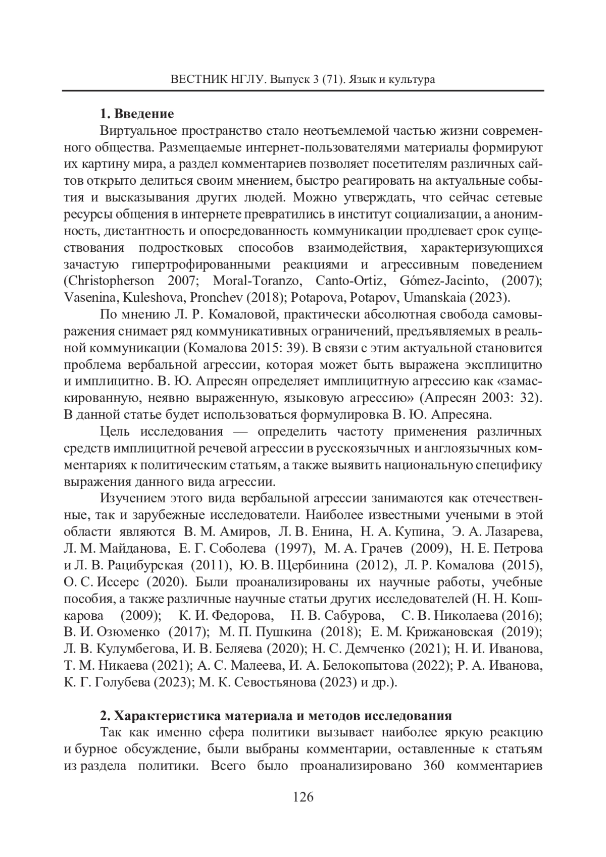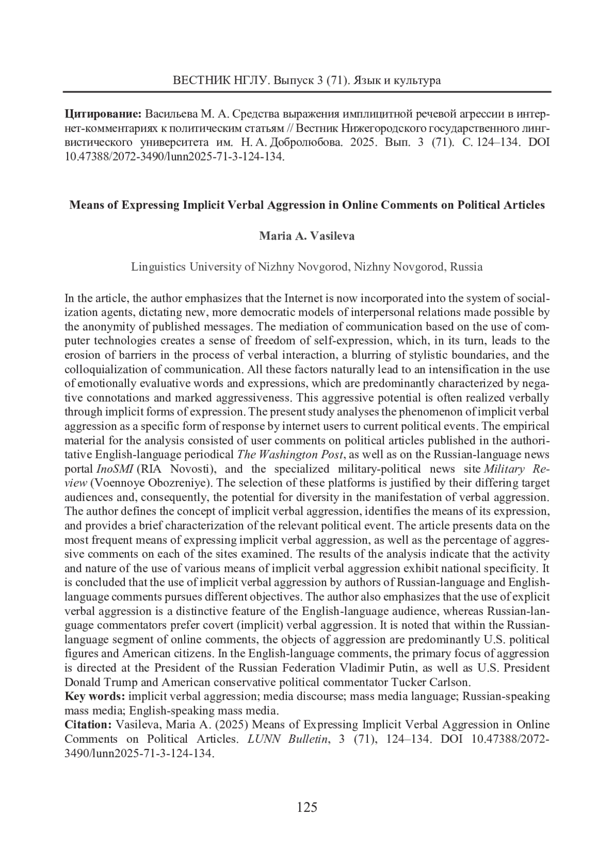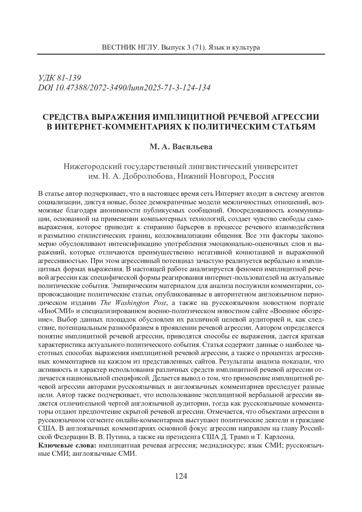 ВАСИЛЬЕВА М. А. СРЕДСТВА ВЫРАЖЕНИЯ ИМПЛИЦИТНОЙ РЕЧЕВОЙ АГРЕССИИ В ИНТЕРНЕТ-КОММЕНТАРИЯХ К ПОЛИТИЧЕСКИМ СТАТЬЯМ // ВЕСТНИК НИЖЕГОРОДСКОГО ГОСУДАРСТВЕННОГО ЛИНГВИСТИЧЕСКОГО УНИВЕРСИТЕТА ИМ. Н. А. ДОБРОЛЮБОВА. 2025. № 3 (71)