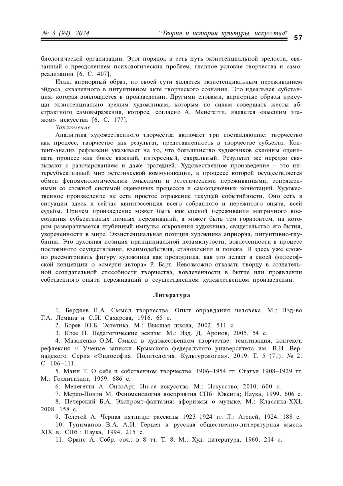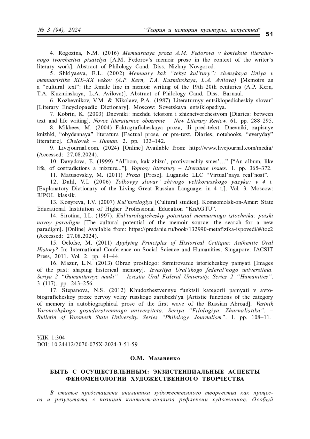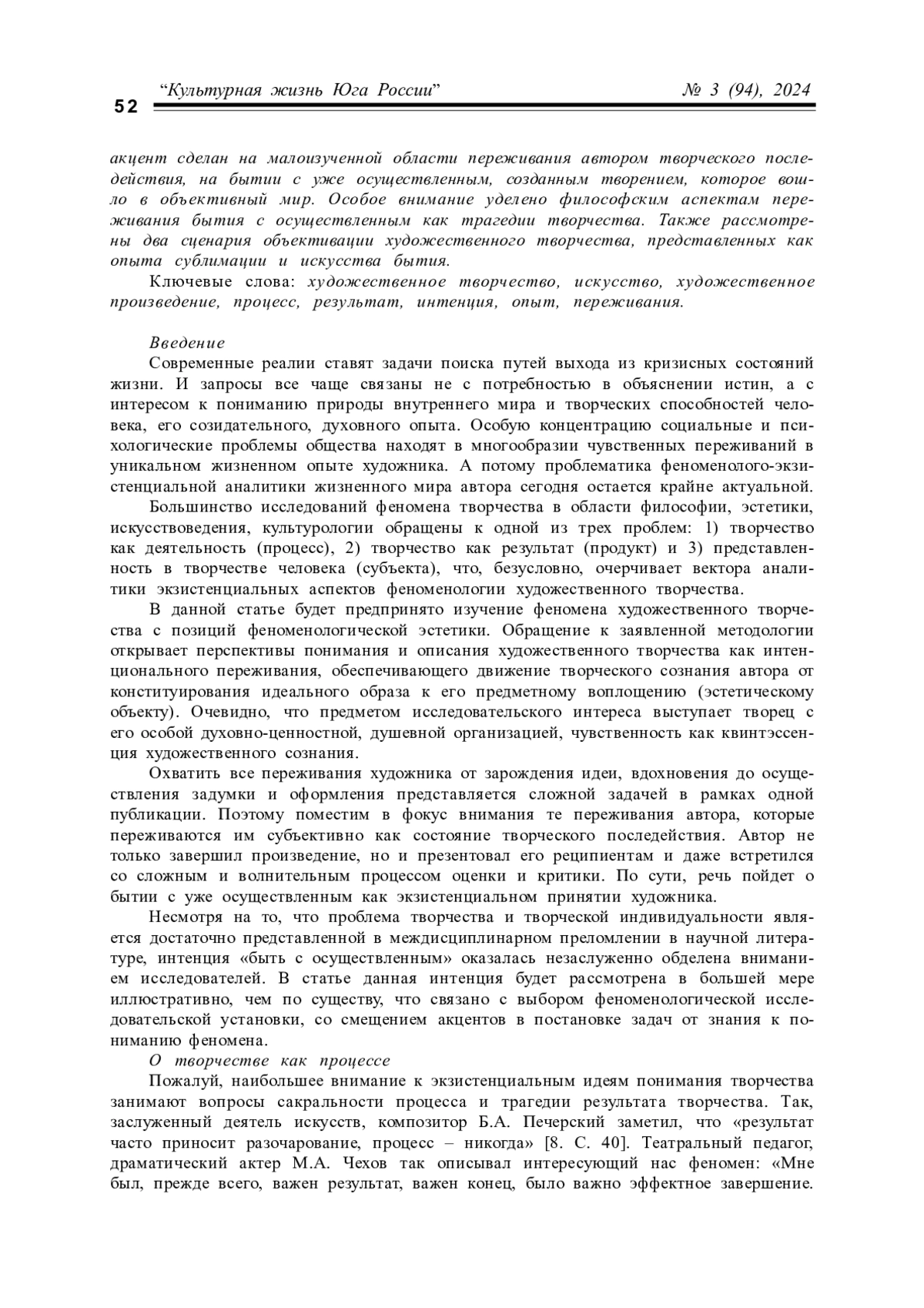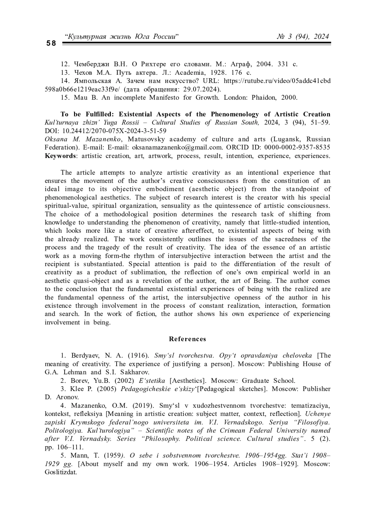 МАЗАНЕНКО О. М. БЫТЬ С ОСУЩЕСТВЛЕННЫМ: ЭКЗИСТЕНЦИАЛЬНЫЕ АСПЕКТЫ ФЕНОМЕНОЛОГИИ ХУДОЖЕСТВЕННОГО ТВОРЧЕСТВА // КУЛЬТУРНАЯ ЖИЗНЬ ЮГА РОССИИ. 2024. № 3 (94)