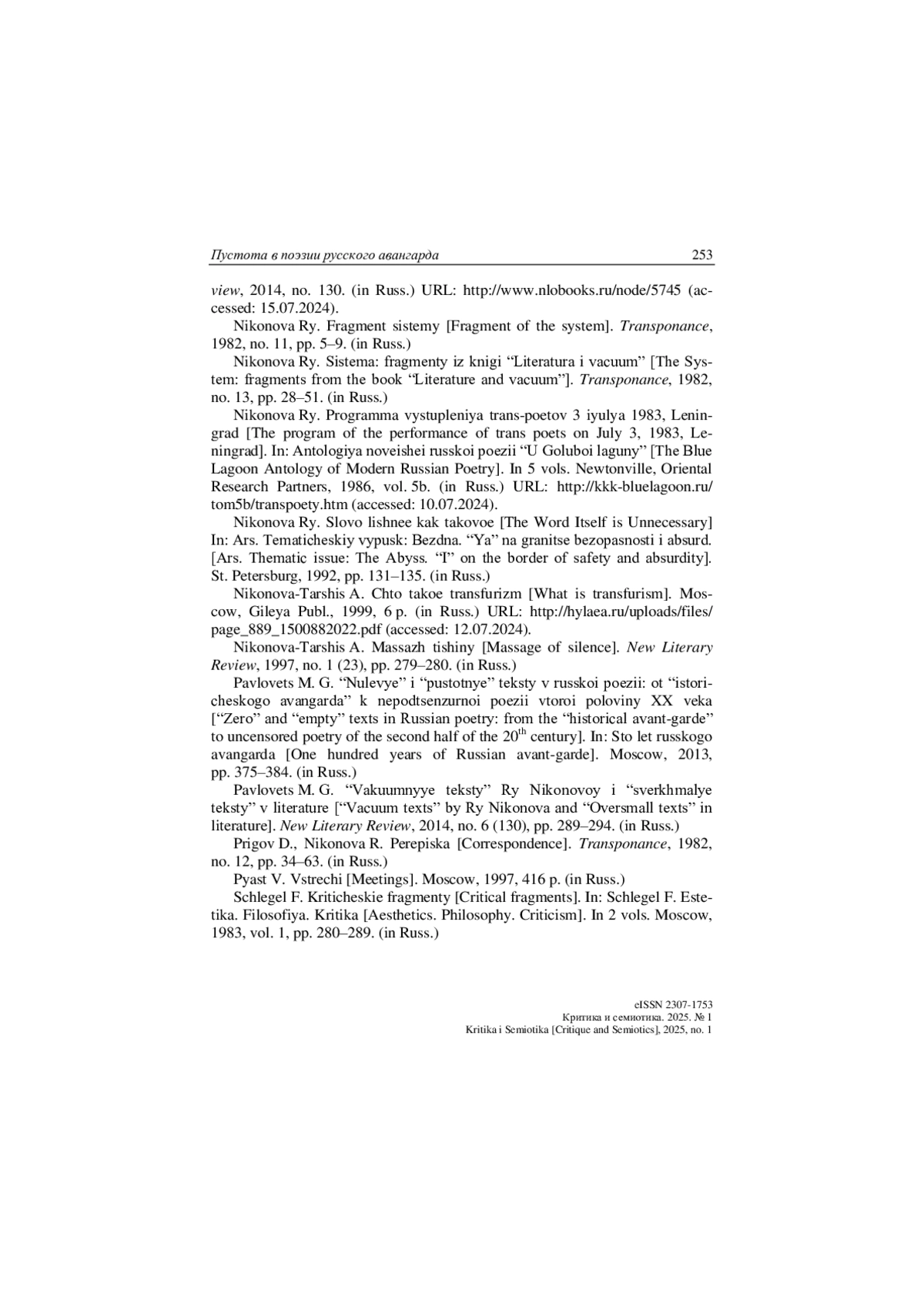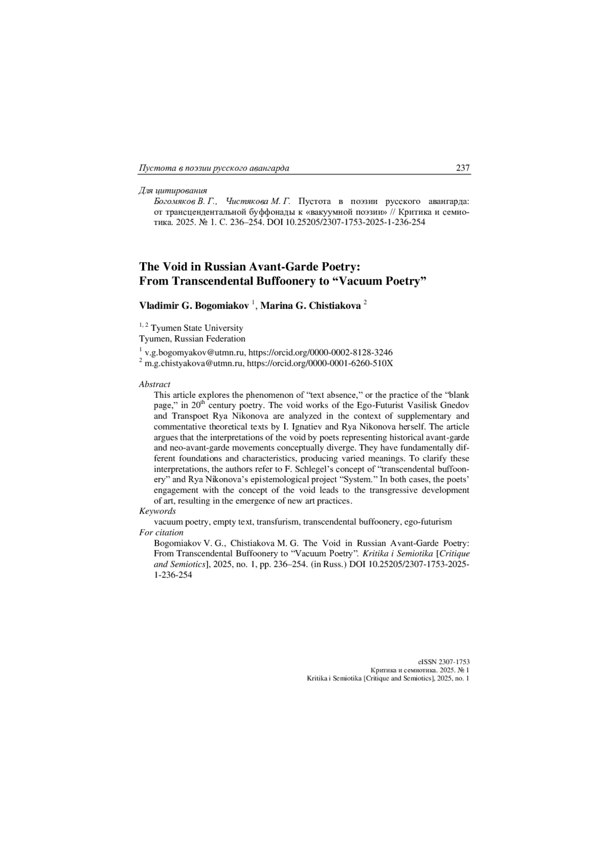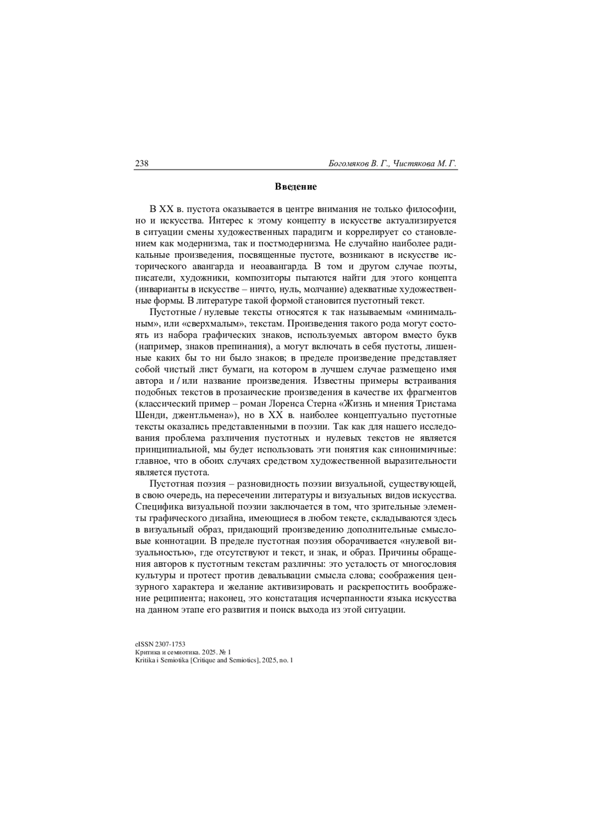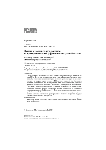 БОГОМЯКОВ В. Г., ЧИСТЯКОВА М. Г. ПУСТОТА В ПОЭЗИИ РУССКОГО АВАНГАРДА: ОТ ТРАНСЦЕНДЕНТАЛЬНОЙ БУФФОНАДЫ К «ВАКУУМНОЙ ПОЭЗИИ» // КРИТИКА И СЕМИОТИКА. 2025. № 1