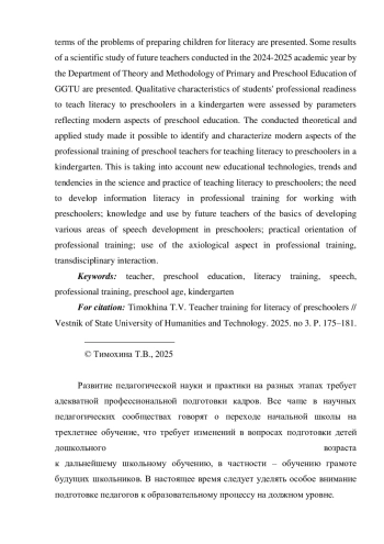 8. Тимохина Т.В. Подготовка будущих педагогов к аналитической деятельности // Вестник Государственного гуманитарно-технологического университета. 2024. № 3. С. 146-152. EDN: IKFCMQ