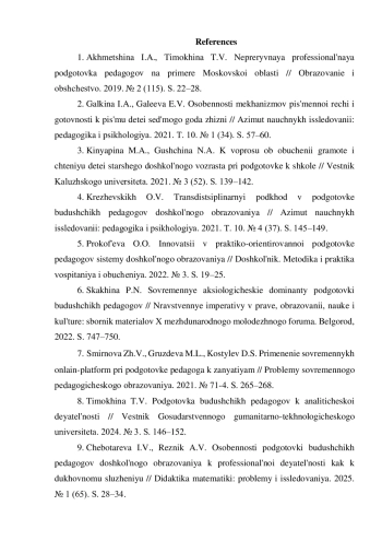 11. Шендрикова С.П., Бахича Э.Э. Модернизация содержания профессиональной подготовки педагога дошкольного образования в условиях цифровизации // Интеграция науки и образования в XXI веке: педагогика детства, специальная психология и дефектология. Сборник статей по материалам всероссийской научно-практической конференции. Ульяновск, 2025. С. 191-199. EDN: PPXAXJ