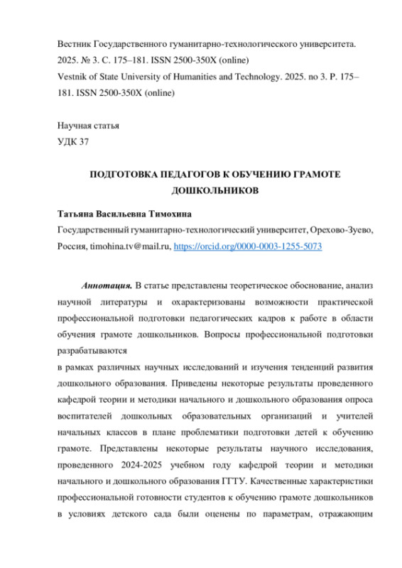 В статье представлены теоретическое обоснование, анализ научной литературы и охарактеризованы возможности практической профессиональной подготовки педагогических кадров к работе в области обучения грамоте дошкольников. Вопросы профессиональной подготовки разрабатываются в рамках различных научных исследований и изучения тенденций развития дошкольного образования. Приведены некоторые результаты проведенного кафедрой теории и методики начального и дошкольного образования опроса воспитателей дошкольных образовательных организаций и учителей начальных классов в плане проблематики подготовки детей к обучению грамоте. Представлены некоторые результаты научного исследования, проведенного 2024-2025 учебном году кафедрой теории и методики начального и дошкольного образования ГГТУ. Качественные характеристики профессиональной готовности студентов к обучению грамоте дошкольников в условиях детского сада были оценены по параметрам, отражающим современные аспекты дошкольного образования. Проведенное теоретическое и прикладное исследование позволило выявить и охарактеризовать современные аспекты профессиональной подготовки педагогов дошкольного образования к обучению грамоте дошкольников в условиях детского сада. Это учет новых образовательных технологий, тенденций и веяний в науке и практике обучения грамоте дошкольников; необходимость развития информационной грамотности в профессиональной подготовке к работе с дошкольниками; знание и использование будущими педагогами основ развития речи у дошкольников; практическая ориентированность профессиональной подготовки; использование аксиологического аспекта в профессиональной подготовке, трансдисциплинарное взаимодействие.