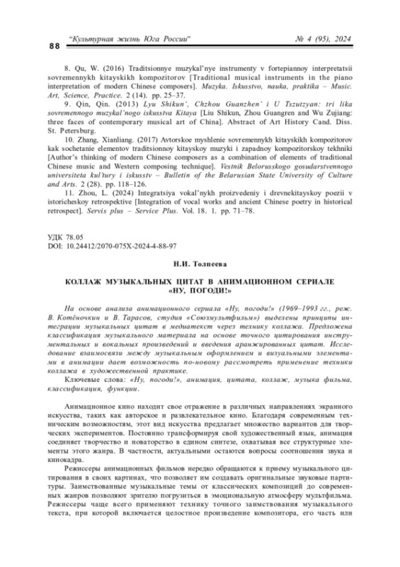 На основе анализа анимационного сериала «Ну, погоди!» (1969–1993 гг., реж. В. Котёночкин и В. Тарасов, студия «Союзмультфильм») выделены принципы интеграции музыкальных цитат в медиатекст через технику коллажа. Предложена классификация музыкального материала на основе точного цитирования инструментальных и вокальных произведений и введения аранжированных цитат. Исследование взаимосвязи между музыкальным оформлением и визуальными элементами в анимации дает возможность по-новому рассмотреть применение техники коллажа в художественной практике