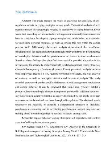 В статье представлены результаты анализа специфики проявления аспектов саморегуляции в способах совладания у молодёжи. В результате теоретического анализа проблемы саморегуляции у молодых людей была выявлена её особая роль для совладающего поведения. Выявлено, что саморегуляция, согласно различным исследованиям, по существу, может выступать с одной стороны в качестве медиатора для адаптивных стратегий совладания, а с другой, быть условием для мобилизации ресурсов личности, а также являться таковым в процессе совладания. Также теоретический анализ показал, что её недостаточное развитие в период юности может способствовать возникновению у личности неадаптивного поведения и преобладанию различных защитных механизмов. Исходя из этого, обнаруженные особенности послужили причинами для исследования специфики отдельных аспектов саморегуляции в способах совладания. В связи с однородностью дисперсии (F-критерий Ливиня) использованы параметрические методы анализа: t-критерий Стьюдента, коэффициент корреляции Пирсона, однофакторный дисперсионный анализ, а также описательные статистики, теоретический анализ. Проведенное исследование выявляет выраженную полоролевую специфику в механизмах самоуправления и совладающего поведения. Можно заключить, что для юношей характерен проактивный, инструментальный стиль преодоления стресса, основанный на волевых ресурсах. У девушек адаптивный потенциал в большей степени определяется способностью сдерживать неконструктивные поведенческие реакции посредством саморегуляции. Полученные результаты подчеркивают необходимость дифференцированного подхода в процессе индивидуального психологического консультирования, при разработке программ психологической поддержки, тренингов, направленных на развитие адаптивных ресурсов личности у молодежи.