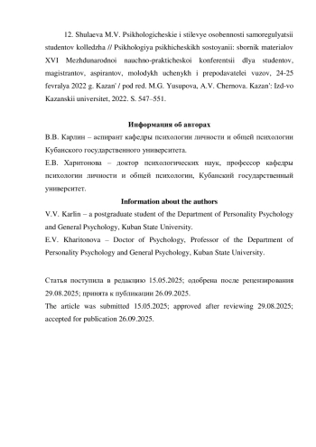 12. Шулаева М.В. Психологические и стилевые особенности саморегуляции студентов колледжа // Психология психических состояний: сборник материалов XVI Международной научно-практической конференции для студентов, магистрантов, аспирантов, молодых ученых и преподавателей вузов, 24-25 февраля 2022 г. Казань / под ред. М.Г. Юсупова, А.В. Чернова. Казань: Изд-во Казанский университет, 2022. С. 547-551. EDN: UIXUCJ