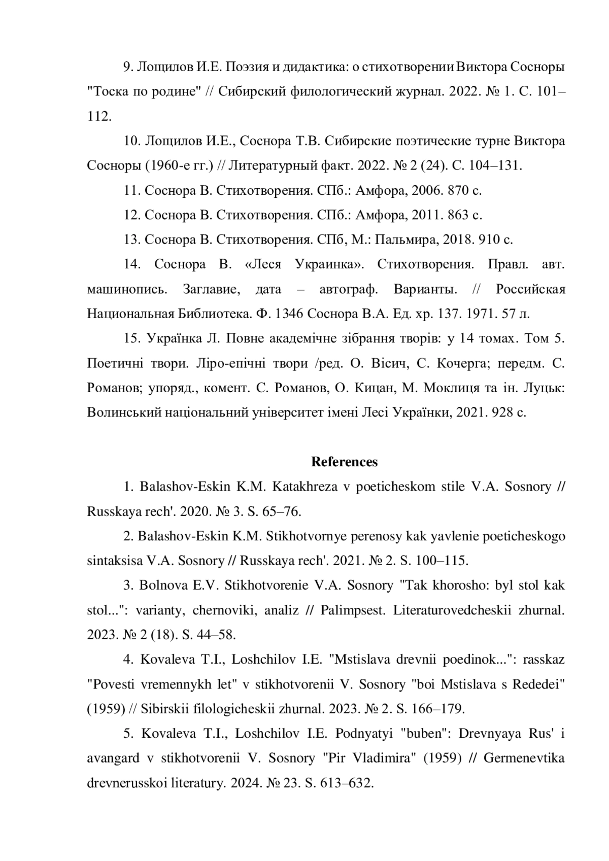 9. Лощилов И.Е. Поэзия и дидактика: о стихотворении Виктора Сосноры “Тоска по родине” // Сибирский филологический журнал. 2022. № 1. С. 101-112. EDN: XAERYR