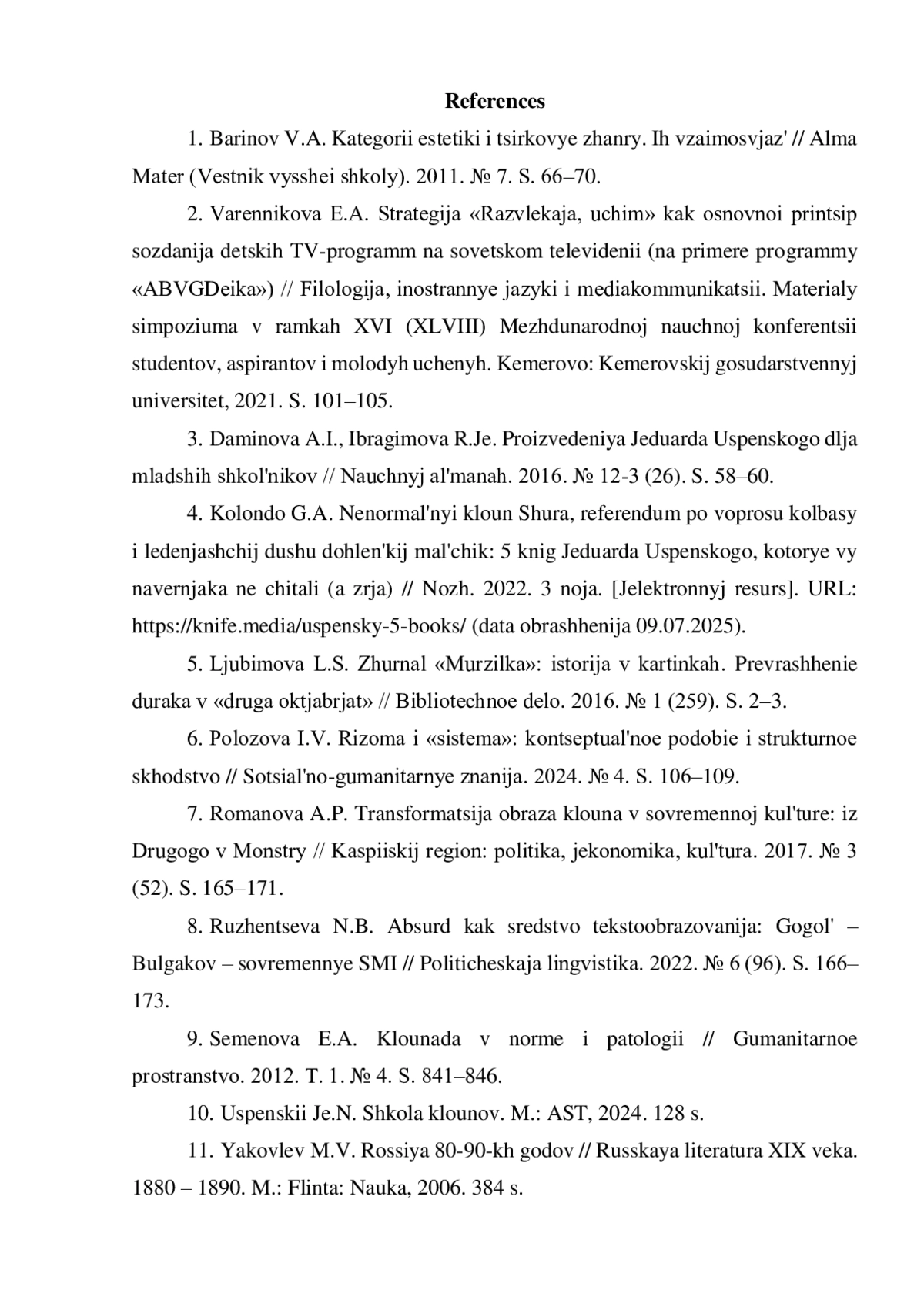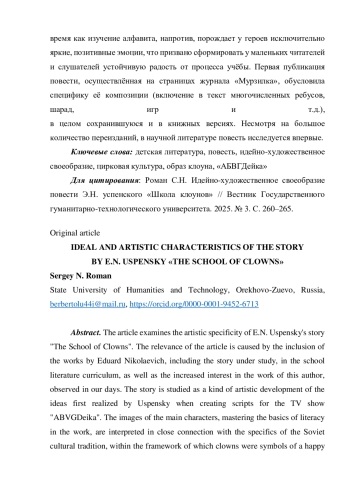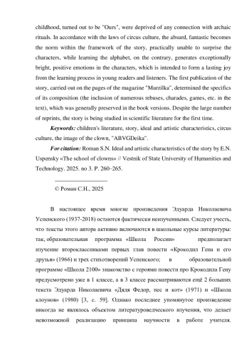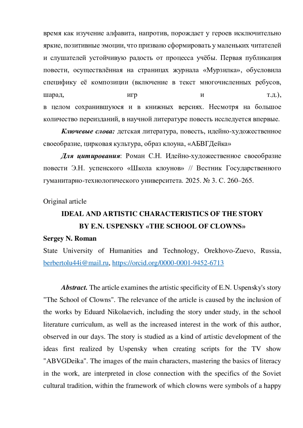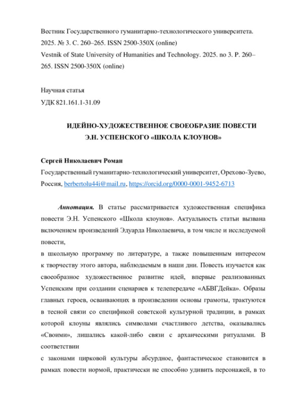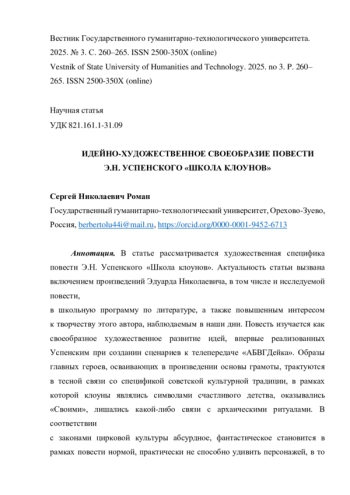РОМАН С. Н. ИДЕЙНО-ХУДОЖЕСТВЕННОЕ СВОЕОБРАЗИЕ ПОВЕСТИ Э. Н. УСПЕНСКОГО «ШКОЛА КЛОУНОВ» // ВЕСТНИК ГОСУДАРСТВЕННОГО ГУМАНИТАРНО-ТЕХНОЛОГИЧЕСКОГО УНИВЕРСИТЕТА. 2025. № 3