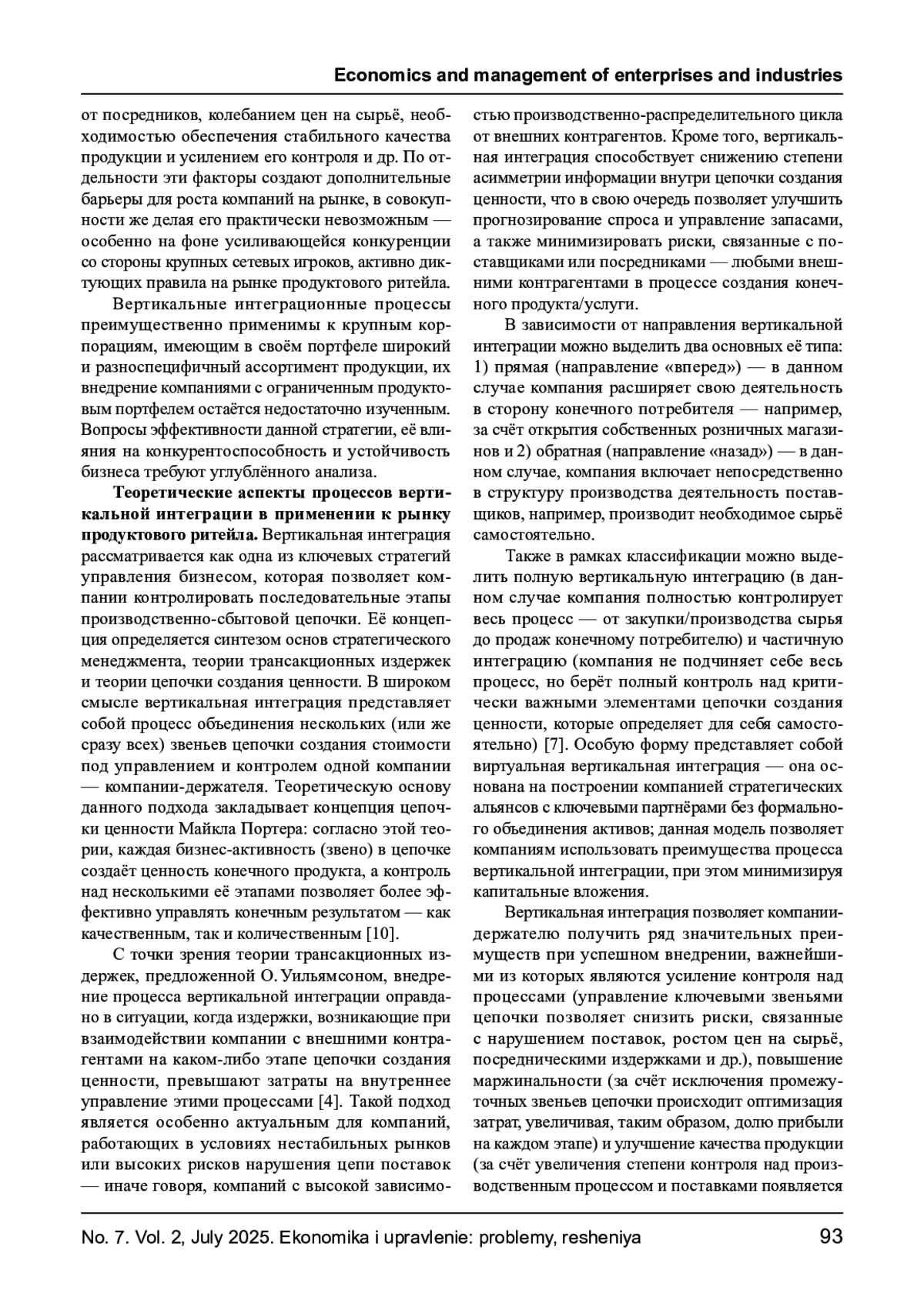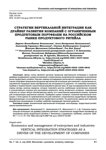 Целью статьи является изучение процессов вертикальной интеграции в качестве драйвера продвижения и развития компаний с ограниченным ассортиментом продукции на российском рынке продуктового ритейла. Научная новизна исследования заключается в смещении акцента на изучение специфики применения процессов вертикальной интеграции для компаний с ограниченным ассортиментом продукции (моно-портфельных) как инструмента их развития, что позволяет восполнить пробелы в теоретической и практической разработке данной темы. В ходе исследования были использованы методы анализа иерархии, которые позволили достичь комбинации качественных описаний и количественного анализа для достижения результата, метод экспертного интервью, позволяющий получить не только чёткую количественную оценку, но и качественное вариативное мнение, полезное для интерпретации результатов анализа. Проведена оценка основных стратегий вертикальной интеграции с точки зрения их привлекательности для компаний с ограниченным продуктовым портфелем, функционирующих на российском рынке продуктового ритейла. По результатам оценки для компаний разработаны рекомендации по выбору наиболее подходящей стратегии развития.