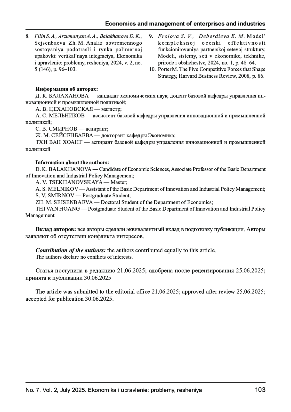 8. Филин С. А., Арзуманян А. А., Балаханова Д. К., Сейсенбаева Ж. М. Анализ современного состояния подотрасли и рынка полимерной упаковки: вертикальная интеграция // Экономика и управление: проблемы, решения. 2024. Т. 2.№ 5 (146). С. 96-103. EDN: MUPOCB