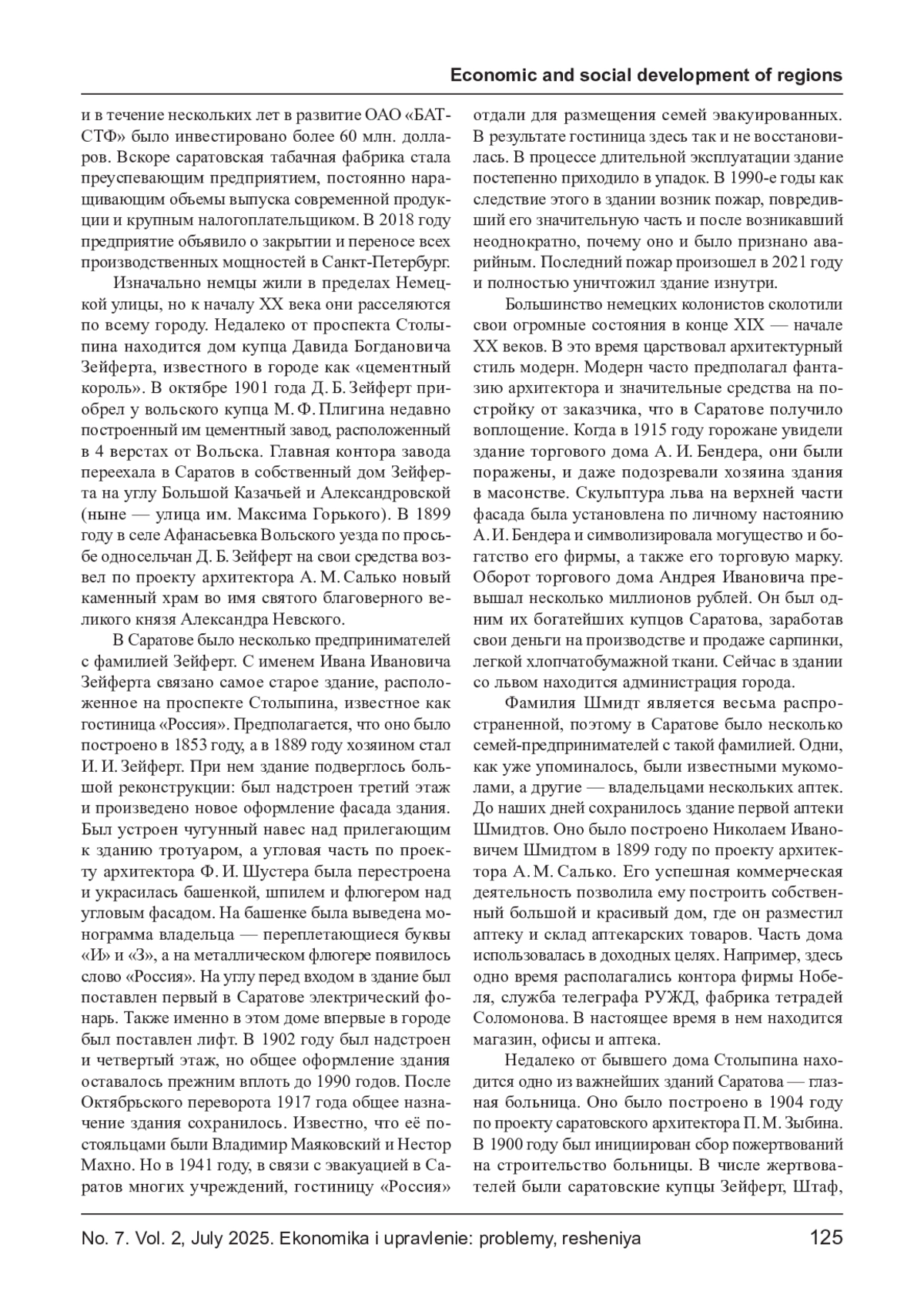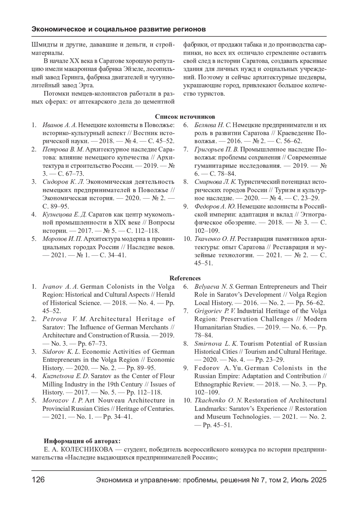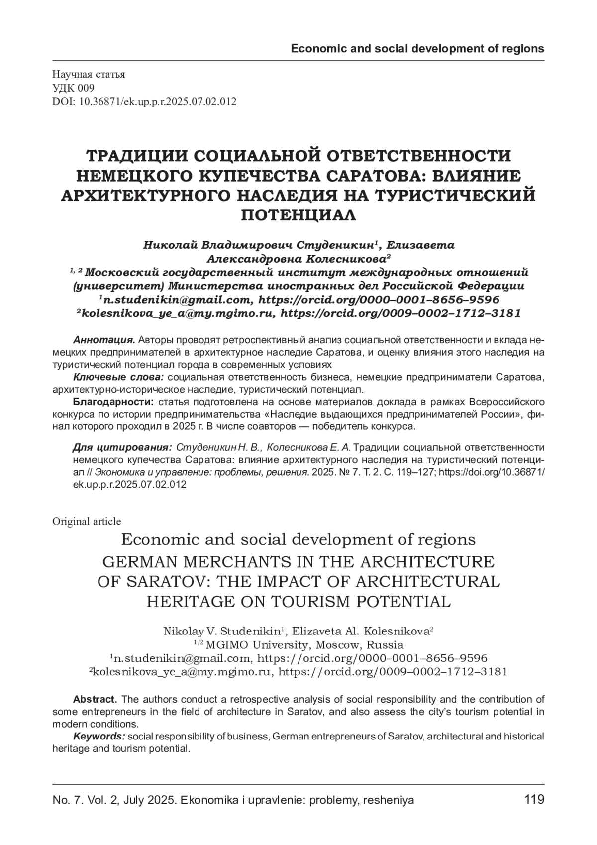 СТУДЕНИКИН Н. В., КОЛЕСНИКОВА Е. А. ТРАДИЦИИ СОЦИАЛЬНОЙ ОТВЕТСТВЕННОСТИ НЕМЕЦКОГО КУПЕЧЕСТВА САРАТОВА: ВЛИЯНИЕ АРХИТЕКТУРНОГО НАСЛЕДИЯ НА ТУРИСТИЧЕСКИЙ ПОТЕНЦИАЛ // ЭКОНОМИКА И УПРАВЛЕНИЕ: ПРОБЛЕМЫ, РЕШЕНИЯ. 2025. ТОМ 2 № 7