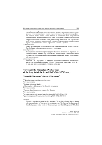 Целью статьи является комплексный анализ вербального и музыкального текстов двух песен, посвященных Еревану постмодерной эпохи. Выбор песен неслучаен, так как они стали знаковыми для целой эпохи. Для достижения поставленной цели были решены следующие задачи: проведен композиционный анализ песенных и нотных текстов, выявлены основные стилистические приемы, а также связи песен о Ереване с базовыми концептами армянской лингвокультуры и традиций городского песенного фольклора.