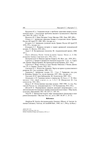 3. Бурматов М. А. Эстрадная песня: к проблеме трактовки жанра в музыкальной науке // Актуальные проблемы высшего музыкального образования. 2018. № 3 (49). С. 82-86.