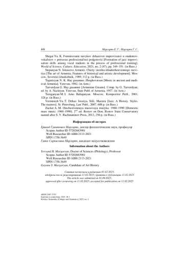 18. Шегай Ю. К. Формирование навыков джазовой импровизации у студентов-вокалистов в процессе профессиональной подготовки // Мир науки, культуры, образования. 2021. № 2 (87). C. 349-351.