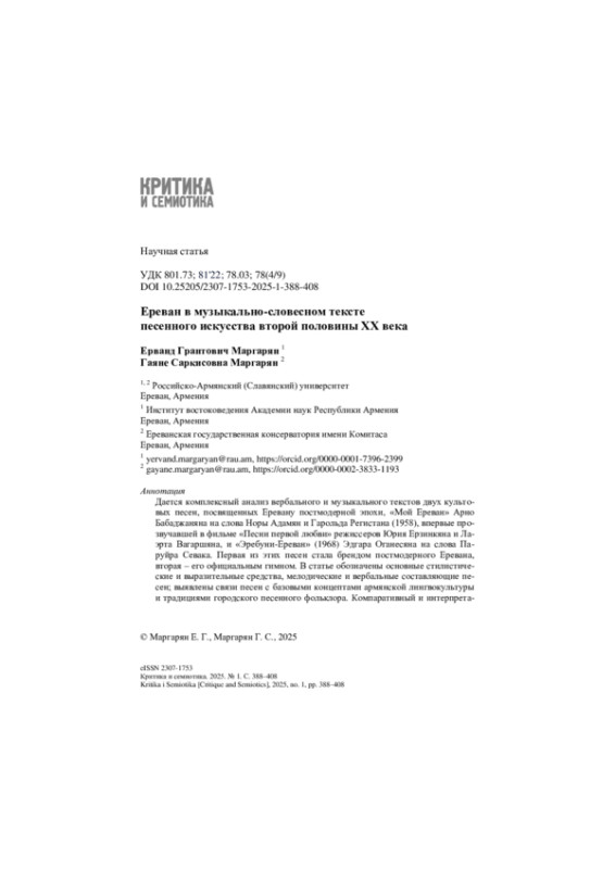 Дается комплексный анализ вербального и музыкального текстов двух культовых песен, посвященных Еревану постмодерной эпохи, «Мой Ереван» Арно Бабаджаняна на слова Норы Адамян и Гарольда Регистана (1958), впервые прозвучавшей в фильме «Песни первой любви» режиссеров Юрия Ерзинкяна и Лаэрта Вагаршяна, и «Эребуни-Ереван» (1968) Эдгара Оганесяна на слова Паруйра Севака. Первая из этих песен стала брендом постмодерного Еревана, вторая - его официальным гимном. В статье обозначены основные стилистические и выразительные средства, мелодические и вербальные составляющие песен; выявлены связи песен с базовыми концептами армянской лингвокультуры и традициями городского песенного фольклора. Компаративный и интерпретативный анализ вербальных текстов позволил выявить основные стилистические приемы, «очеловечивающие» песню, рассмотреть способы проявления рефлексии авторов песен, понять, какие явления и тенденции были актуальными в обозначенный исторический период, какие культурные тренды доминировали и какие социальные силы выступали заказчиками, какие цели они преследовали. В статье показано, как со сменой поколений происходила трансформация вкусов и предпочтений и как это отражалось в песнях о Ереване.