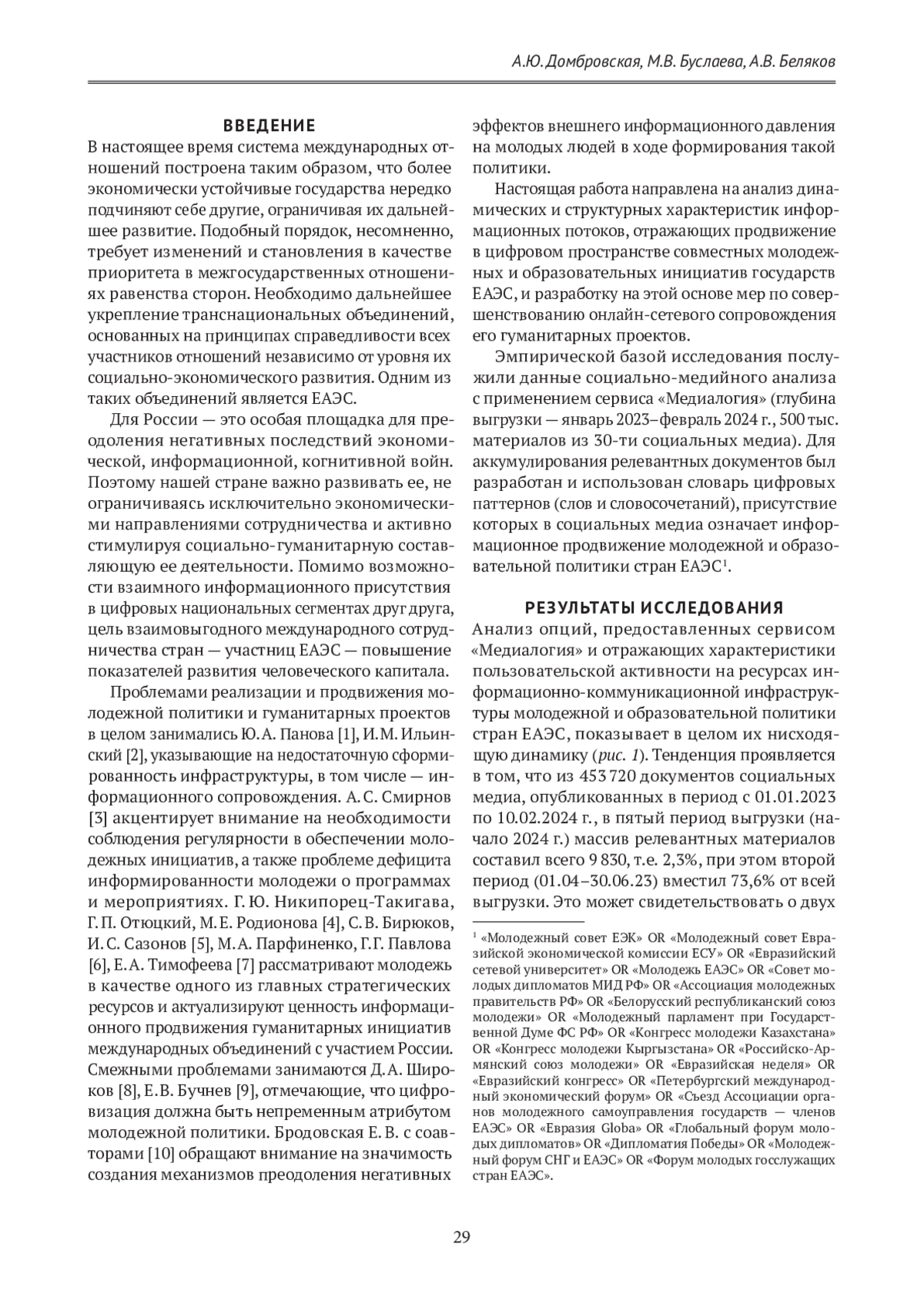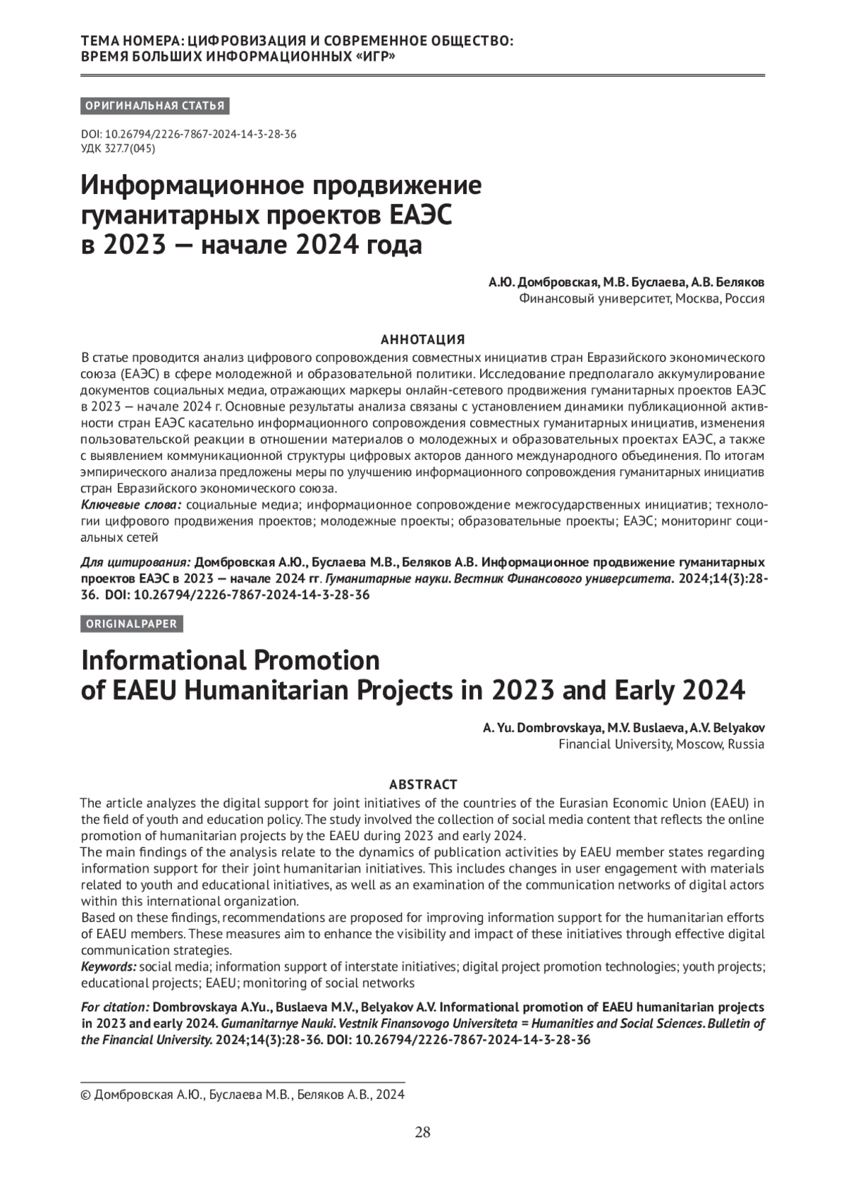 В статье проводится анализ цифрового сопровождения совместных инициатив стран Евразийского экономического союза (ЕАЭС) в сфере молодежной и образовательной политики. Исследование предполагало аккумулирование документов социальных медиа, отражающих маркеры онлайн-сетевого продвижения гуманитарных проектов ЕАЭС в 2023 — начале 2024 г. Основные результаты анализа связаны с установлением динамики публикационной активности стран ЕАЭС касательно информационного сопровождения совместных гуманитарных инициатив, изменения пользовательской реакции в отношении материалов о молодежных и образовательных проектах ЕАЭС, а также с выявлением коммуникационной структуры цифровых акторов данного международного объединения. По итогам эмпирического анализа предложены меры по улучшению информационного сопровождения гуманитарных инициатив стран Евразийского экономического союза.