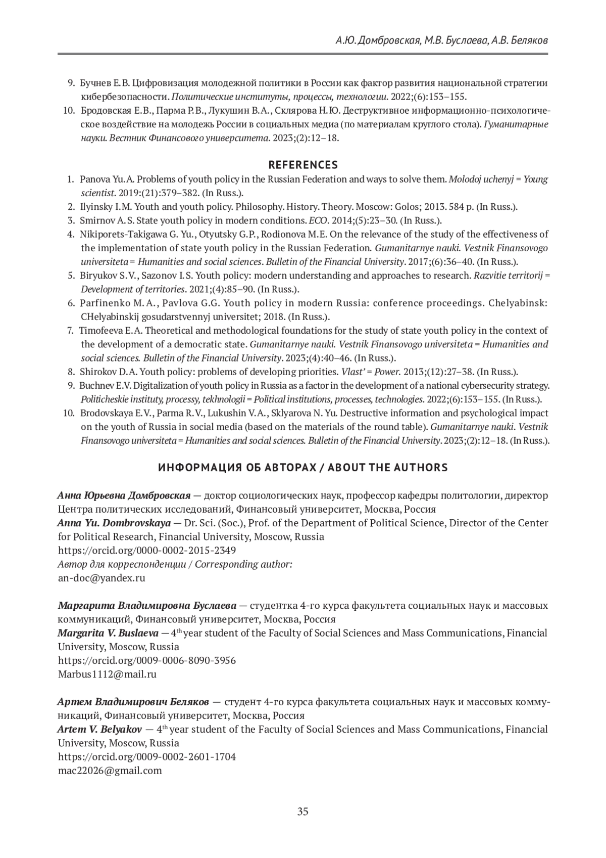 10. Бродовская Е. В., Парма Р. В., Лукушин В. А., Склярова Н. Ю. Деструктивное информационно-психологическое воздействие на молодежь России в социальных медиа (по материалам круглого стола). Гуманитарные науки. Вестник Финансового университета. 2023;(2):12-18.