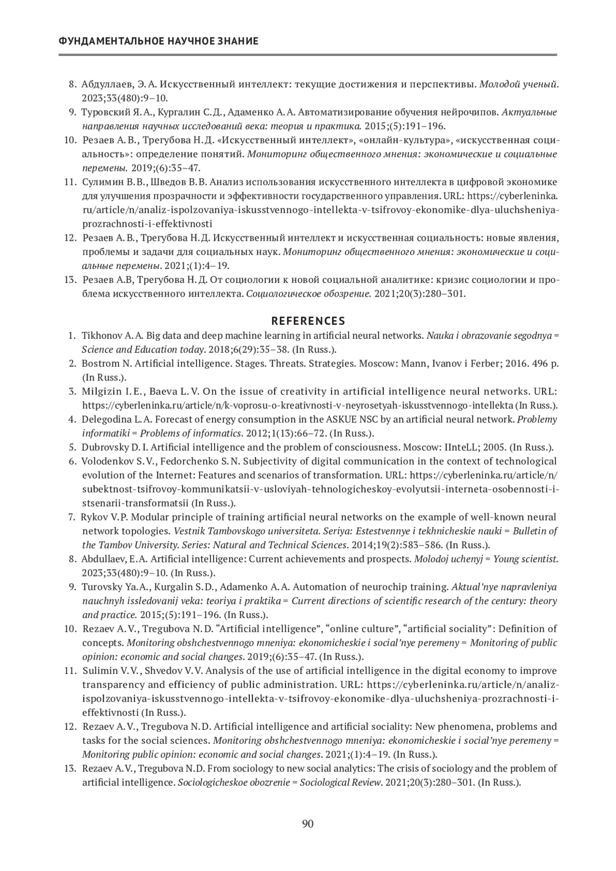 13. Резаев А.В, Трегубова Н. Д. От социологии к новой социальной аналитике: кризис социологии и проблема искусственного интеллекта. Социологическое обозрение. 2021;20(3):280-301.