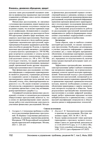 1. Снегирев А. А. Актуальные проблемы и особенности расследования финансовых преступлений // В сборнике: Следственная деятельность: проблемы, их решение, перспективы развития. Материалы VIII Всероссийской молодёжной научно-практической конференции. Москва,2025. С. 220-225. EDN: VUDSNO