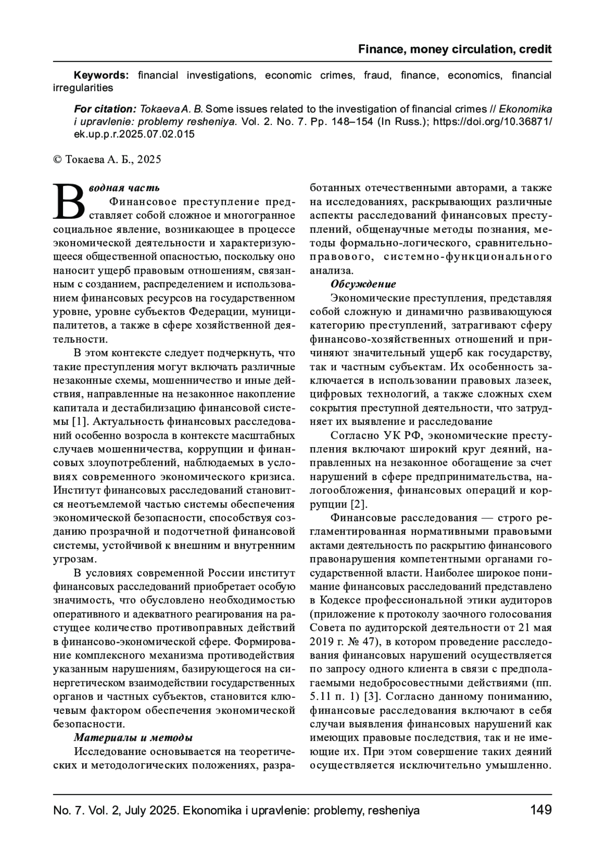 2. Дзагоев С. В. Экономические преступления и практика их расследования //Вестник экономики и права. 2025. № 100. С. 86-92. EDN: BIWAZU