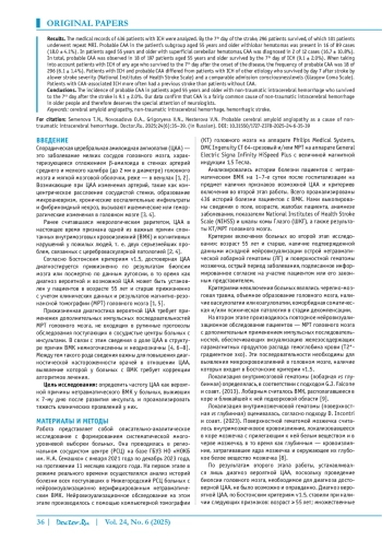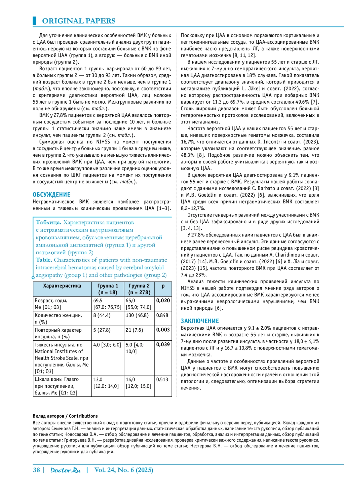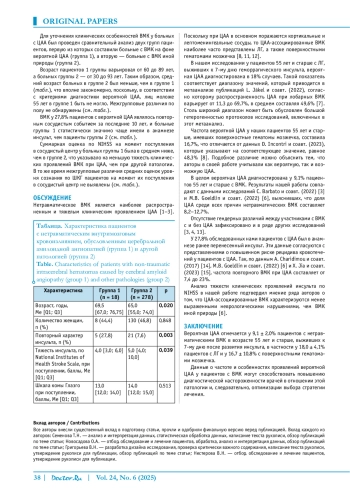 Заключение. Частота вероятной ЦАА у больных 55 лет и старше с нетравматическим ВМК, выживших к 7-му дню после начала заболевания, составляет 9,1 ± 2,0%. Данные о частоте и особенностях проявлений вероятной ЦАА у пациентов с ВМК могут способствовать повышению диагностической настороженности врачей в отношении этой патологии и, следовательно, оптимизации выбора стратегии лечения.
