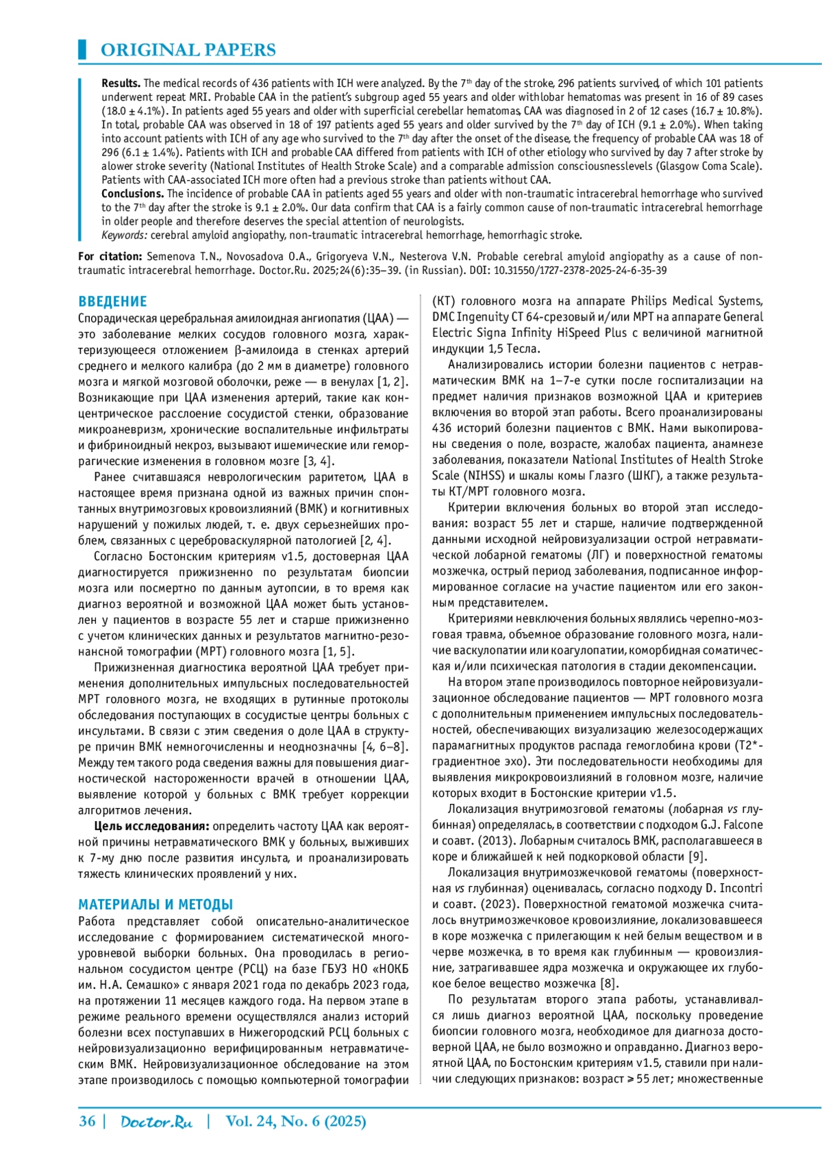 Материалы и методы. Работа проводилась с января 2021 года по декабрь 2023 года, на протяжении 11 месяцев каждого года, в режиме реального времени. На первом этапе работы анализировались истории болезни всех поступавших в Нижегородский региональный сосудистый центр (РСЦ) больных с нейровизуализационно верифицированным нетравматическим ВМК на предмет наличия признаков возможной ЦАА и включения во вторую часть (второй этап) работы. На втором этапе у выживших к 7-му дню после развития ВМК больных, в соответствии с критериями включения (возраст 55 лет и старше, лобарная полушарная гематома или поверхностная гематома мозжечка), проводилась повторная магнитно-резонансная томография (МРТ) головного мозга с применением импульсных последовательностей, обеспечивающих визуализацию железосодержащих парамагнитных продуктов распада гемоглобина крови (Т2*-градиентное эхо). Поскольку прижизненное установление диагноза достоверной ЦАА требует биопсии головного мозга, не доступной в рутинной практике, то в данной работе осуществлялась диагностика лишь вероятной ЦАА, согласно Бостонским критериям v1.5.