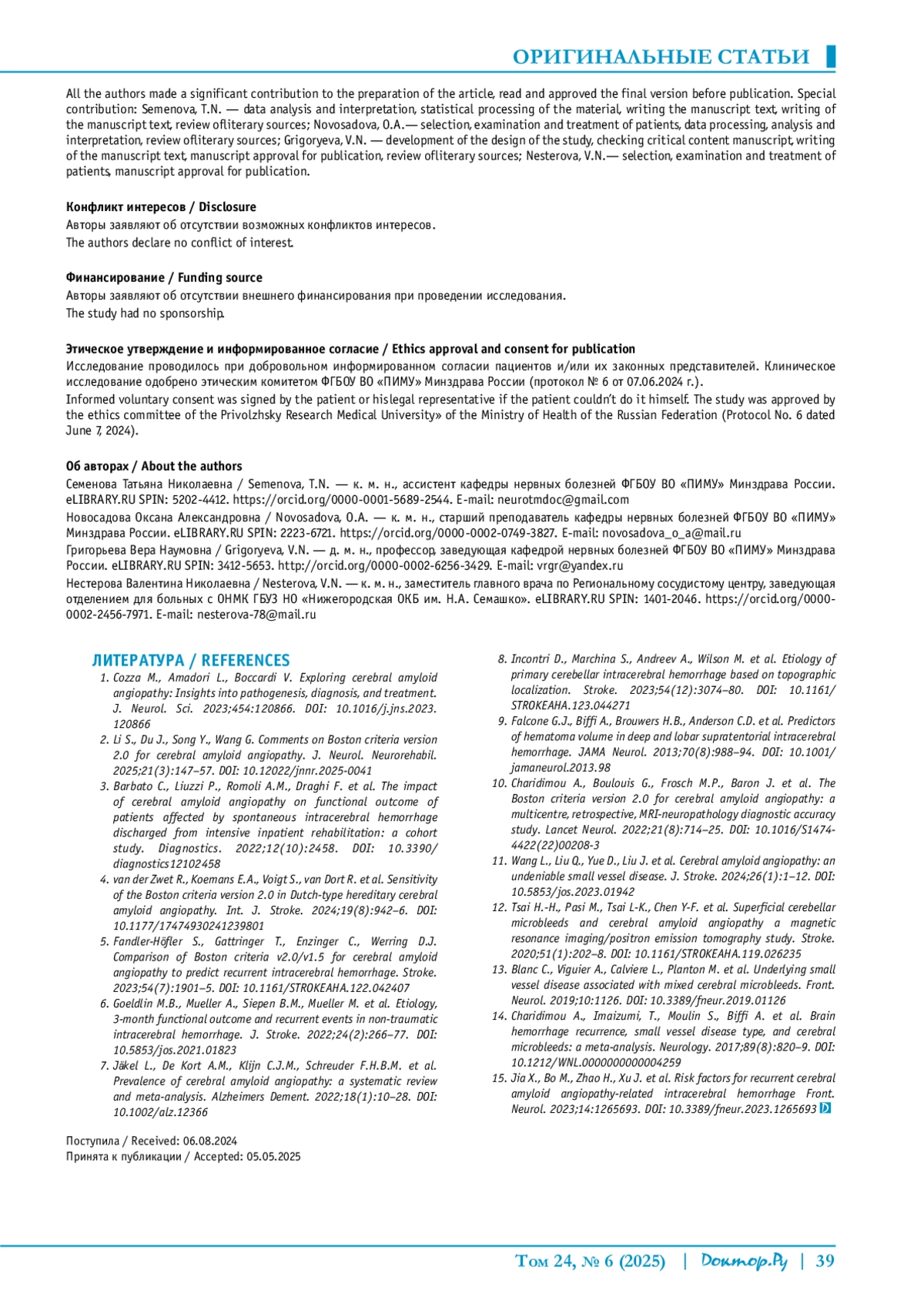 15. Jia X., Bo M., Zhao H., Xu J. et al. Risk factors for recurrent cerebral amyloid angiopathy-related intracerebral hemorrhage Front. Neurol. 2023:14:1265693. 10.3389/fneur.2023.1265693 1Я.