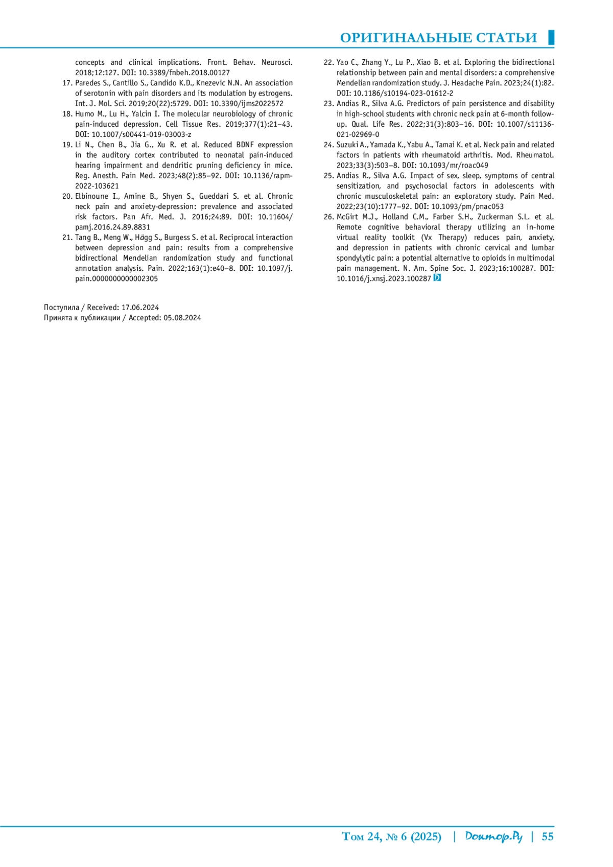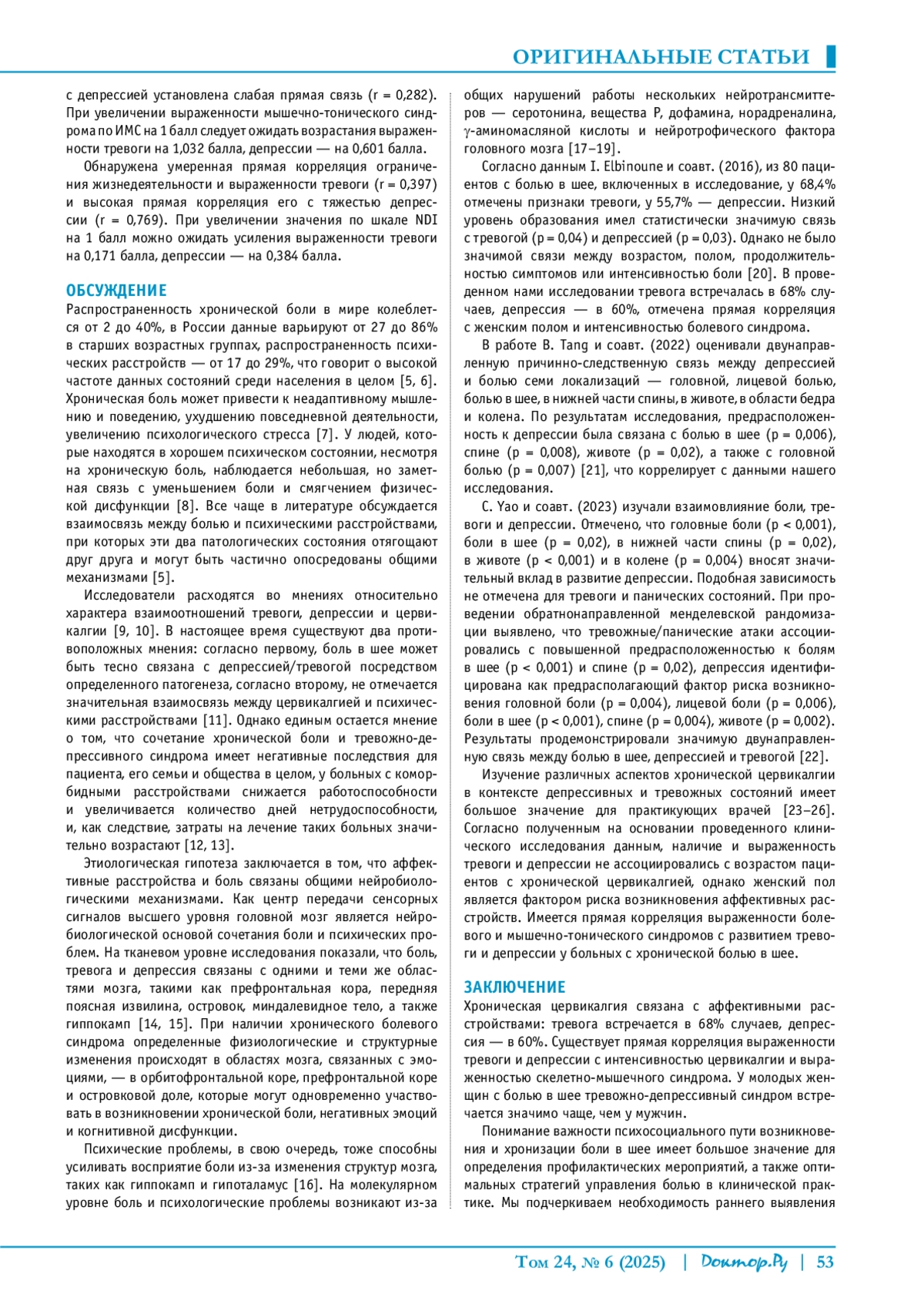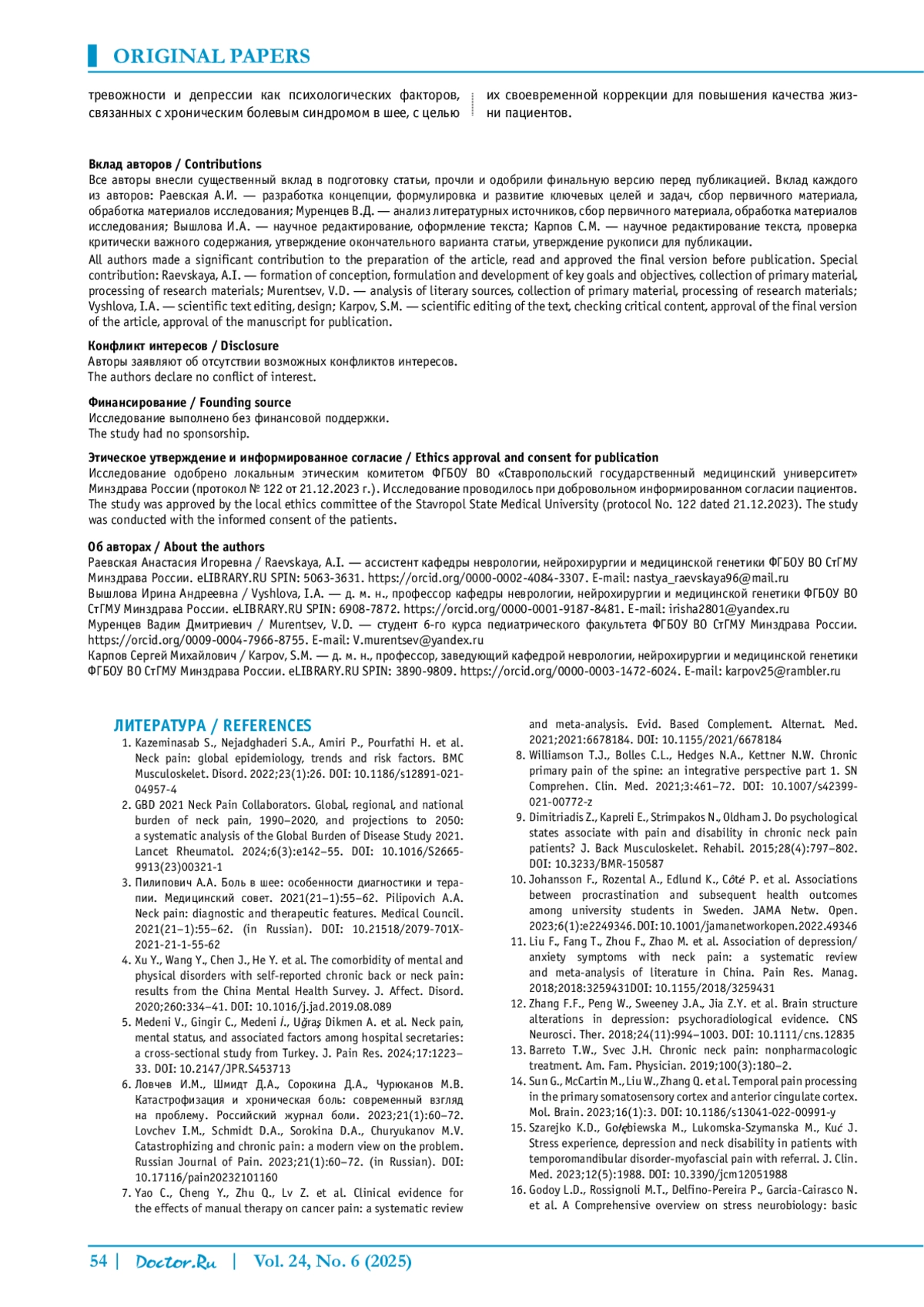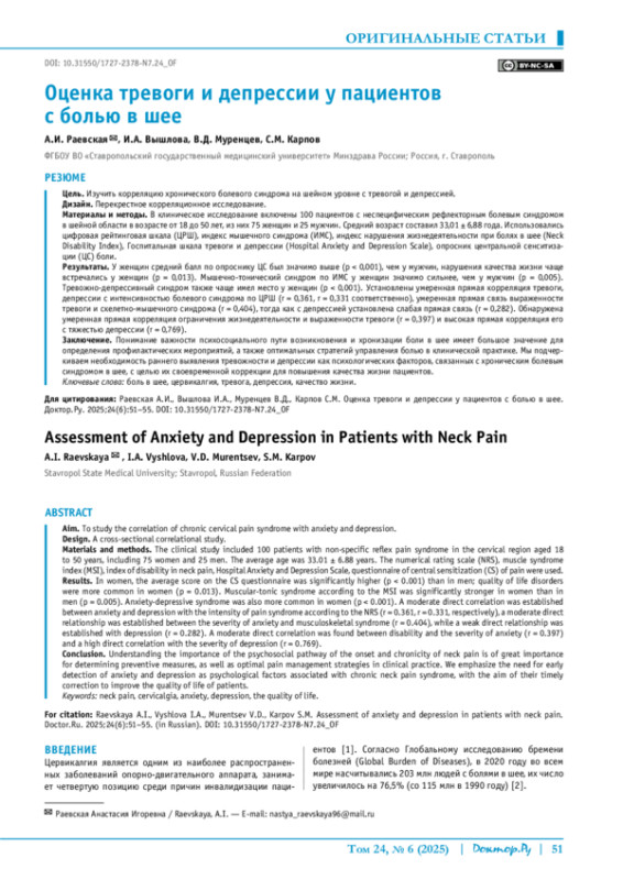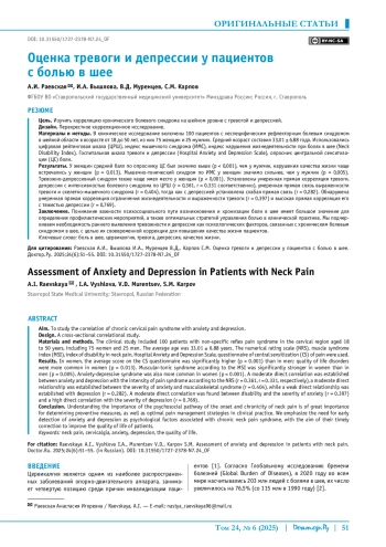 РАЕВСКАЯ А. И., ВЫШЛОВА И. А., МУРЕНЦЕВ В. Д., КАРПОВ С. М. ОЦЕНКА ТРЕВОГИ И ДЕПРЕССИИ У ПАЦИЕНТОВ С БОЛЬЮ В ШЕЕ // ДОКТОР. РУ. 2025. № 6, ТОМ 24