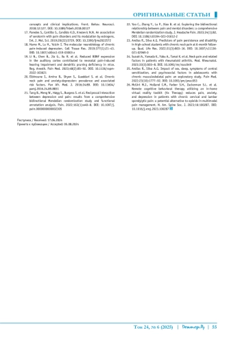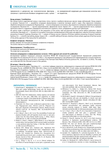 Заключение. Понимание важности психосоциального пути возникновения и хронизации боли в шее имеет большое значение для определения профилактических мероприятий, а также оптимальных стратегий управления болью в клинической практике. Мы подчеркиваем необходимость раннего выявления тревожности и депрессии как психологических факторов, связанных с хроническим болевым синдромом в шее, с целью их своевременной коррекции для повышения качества жизни пациентов.