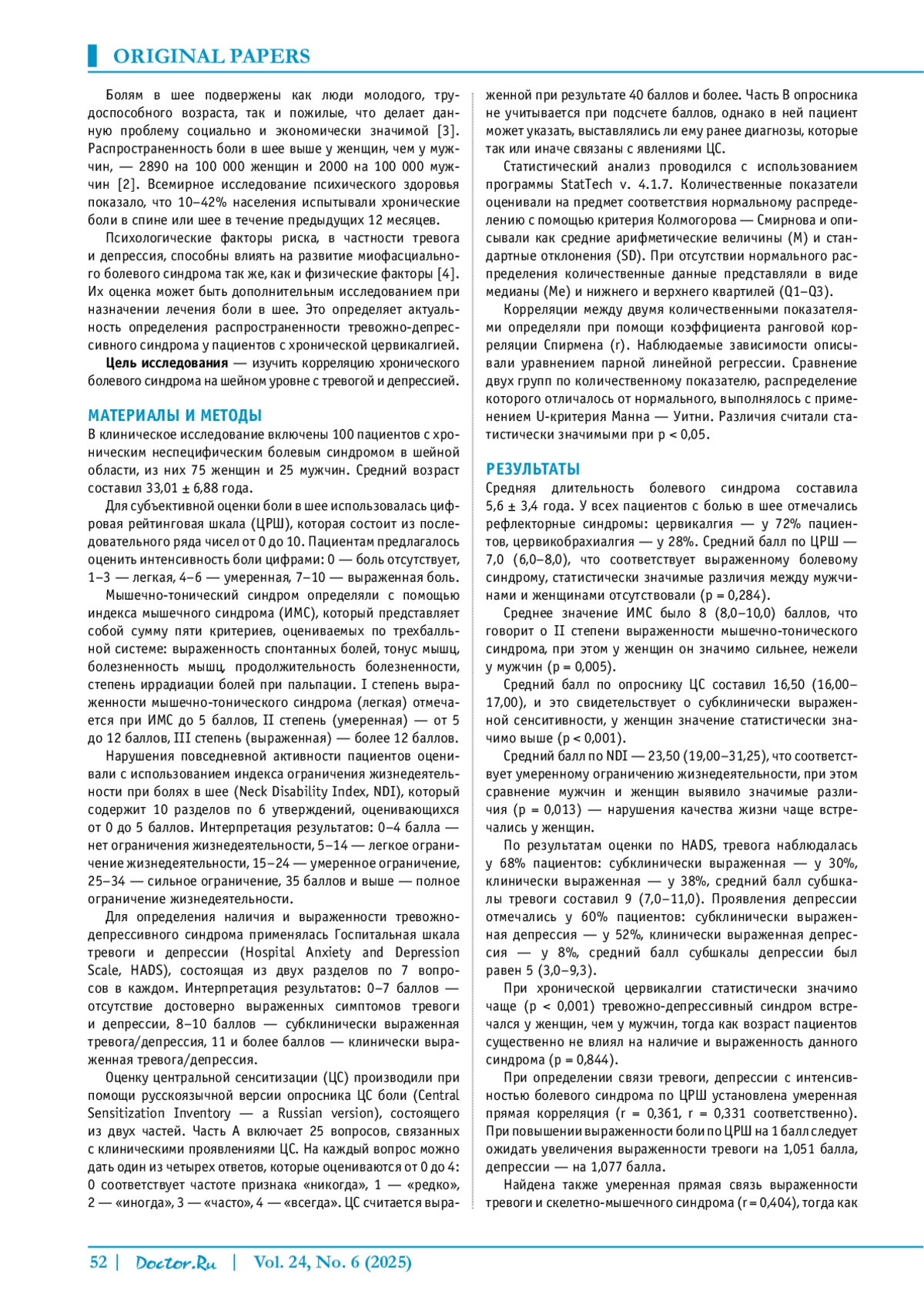 Материалы и методы. В клиническое исследование включены 100 пациентов с неспецифическим рефлекторным болевым синдромом в шейной области в возрасте от 18 до 50 лет, из них 75 женщин и 25 мужчин. Средний возраст составил 33,01 ± 6,88 года. Использовались цифровая рейтинговая шкала (ЦРШ), индекс мышечного синдрома (ИМС), индекс нарушения жизнедеятельности при болях в шее (Neck Disability Index), Госпитальная шкала тревоги и депрессии (Hospital Anxiety and Depression Scale), опросник центральной сенситизации (ЦС) боли.