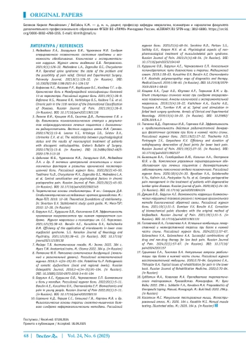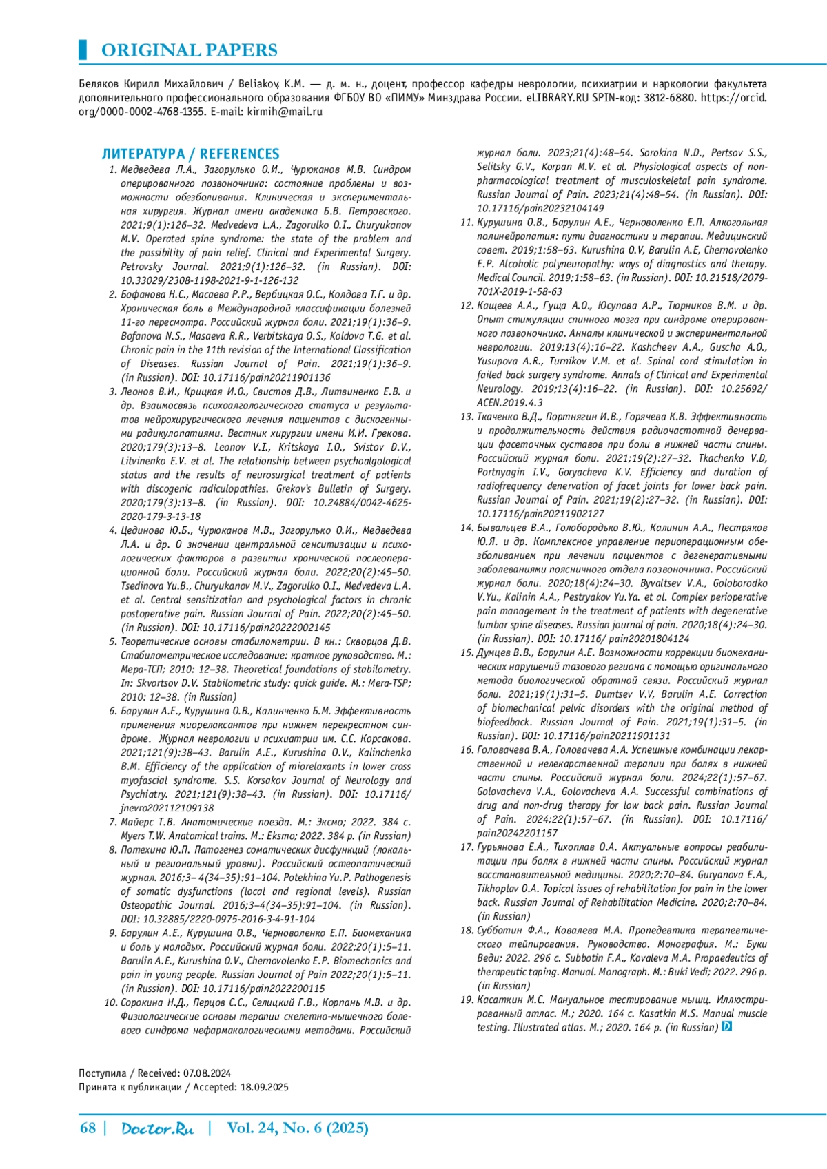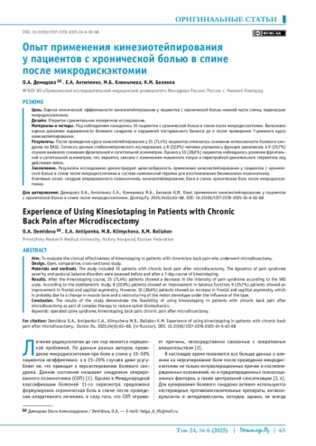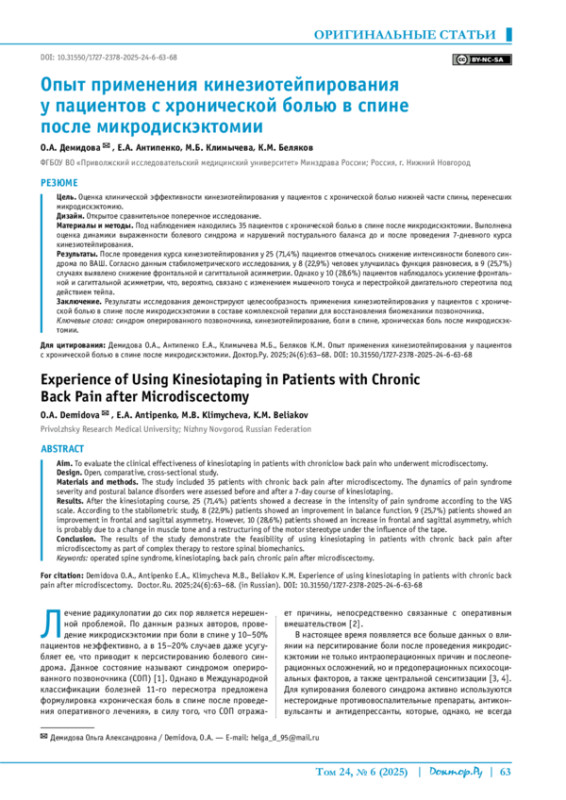 ДЕМИДОВА О. А., АНТИПЕНКО Е. А., КЛИМЫЧЕВА М. Б., БЕЛЯКОВ К. М. ОПЫТ ПРИМЕНЕНИЯ КИНЕЗИОТЕЙПИРОВАНИЯ У ПАЦИЕНТОВ С ХРОНИЧЕСКОЙ БОЛЬЮ В СПИНЕ ПОСЛЕ МИКРОДИСКЭКТОМИИ // ДОКТОР. РУ. 2025. № 6, ТОМ 24