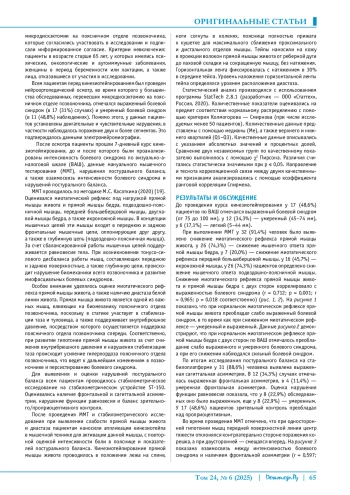 Результаты. После проведения курса кинезиотейпирования у 25 (71,4%) пациентов отмечалось снижение интенсивности болевого синдрома по ВАШ. Согласно данным стабилометрического исследования, у 8 (22,9%) человек улучшилась функция равновесия, в 9 (25,7%) случаях выявлено снижение фронтальной и сагиттальной асимметрии. Однако у 10 (28,6%) пациентов наблюдалось усиление фронтальной и сагиттальной асимметрии, что, вероятно, связано с изменением мышечного тонуса и перестройкой двигательного стереотипа под действием тейпа.