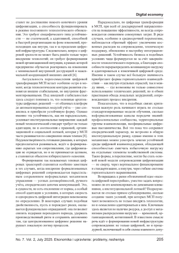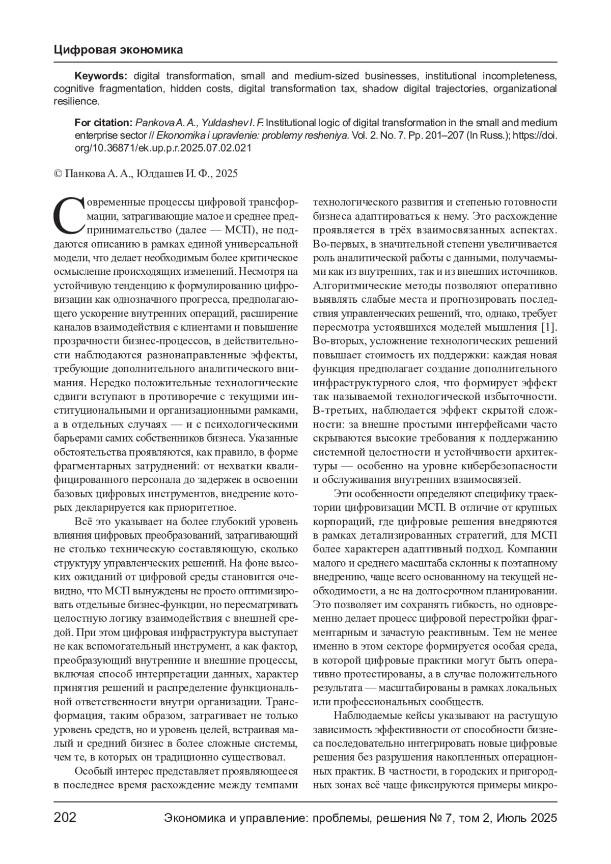Статья посвящена осмыслению процессов цифровой трансформации в секторе малого и среднего предпринимательства. В отличие от устойчивой риторики о прогрессивном характере цифровизации, анализ показывает наличие скрытых противоречий, связанных с институциональной неподготовленностью, когнитивной фрагментацией и организационной уязвимостью. Цифровые изменения затрагивают не только технические параметры, но и структуру управленческих решений, формы координации, распределение мотивации и внутренние механизмы адаптации. Особое внимание уделено феномену теневых цифровых траекторий и формированию горизонтальных сетей взаимопомощи как альтернативной модели институционального сопровождения.
