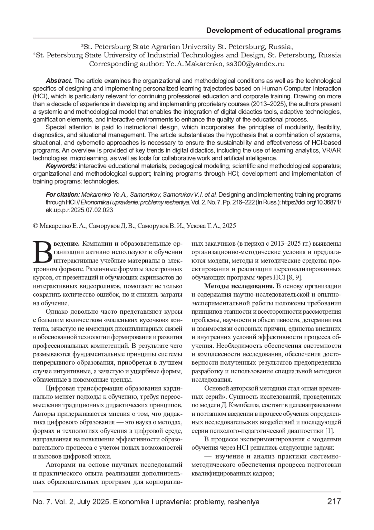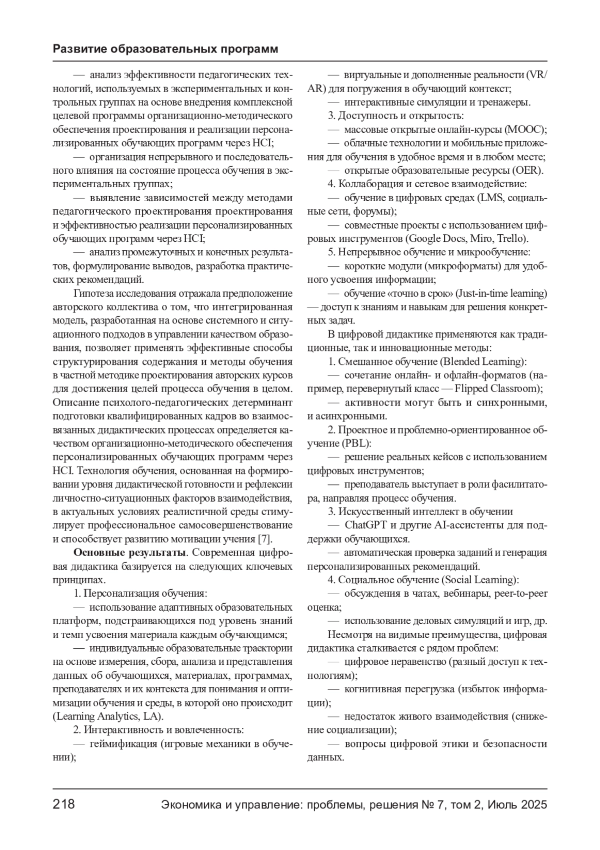 Особое внимание уделено педагогическому проектированию, включающему принципы модульности, гибкости, диагностики и ситуационного управления. Обоснована гипотеза о необходимости сочетания системного, ситуационного и кибернетического подходов для обеспечения устойчивости и эффективности HCI-программ. Приведён обзор ключевых тенденций цифровой дидактики, таких как применение Learning Analytics, использование VR/AR, микрообучение, а также инструменты коллективной работы и искусственного интеллекта.